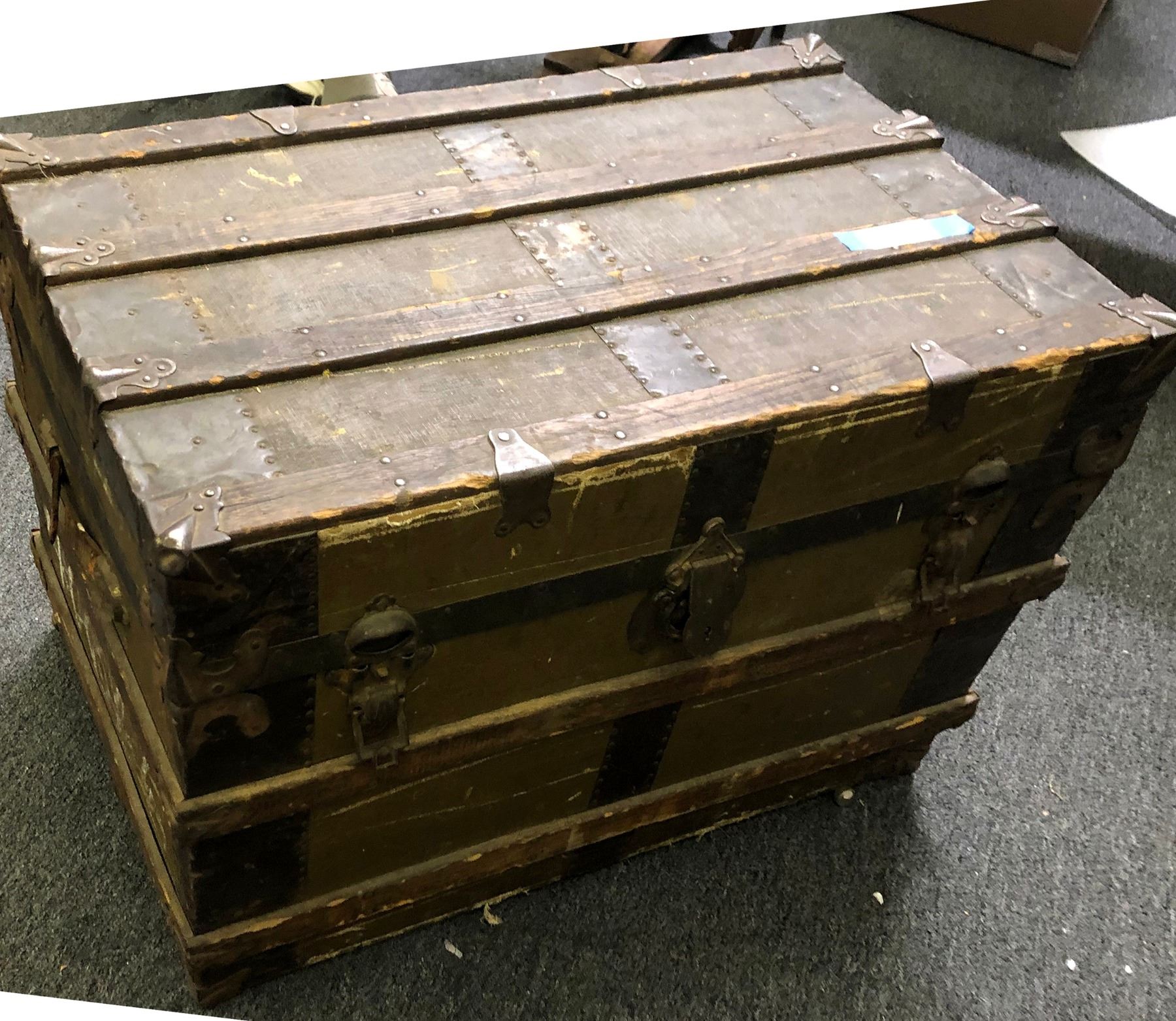 Vintage steamer trunk with with reinforced wood ribs with metal edges, with wheels on the bottom. leather handle on one side broken. 32 x 18 x 23" tall. No tray inside. No maker. C1890-1910. This trunk ended up in Virginia City, Nevada - from where, we'll never know.