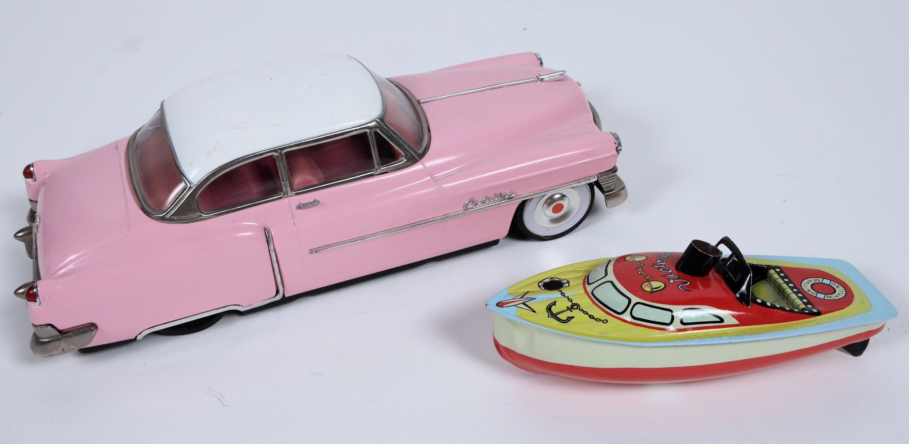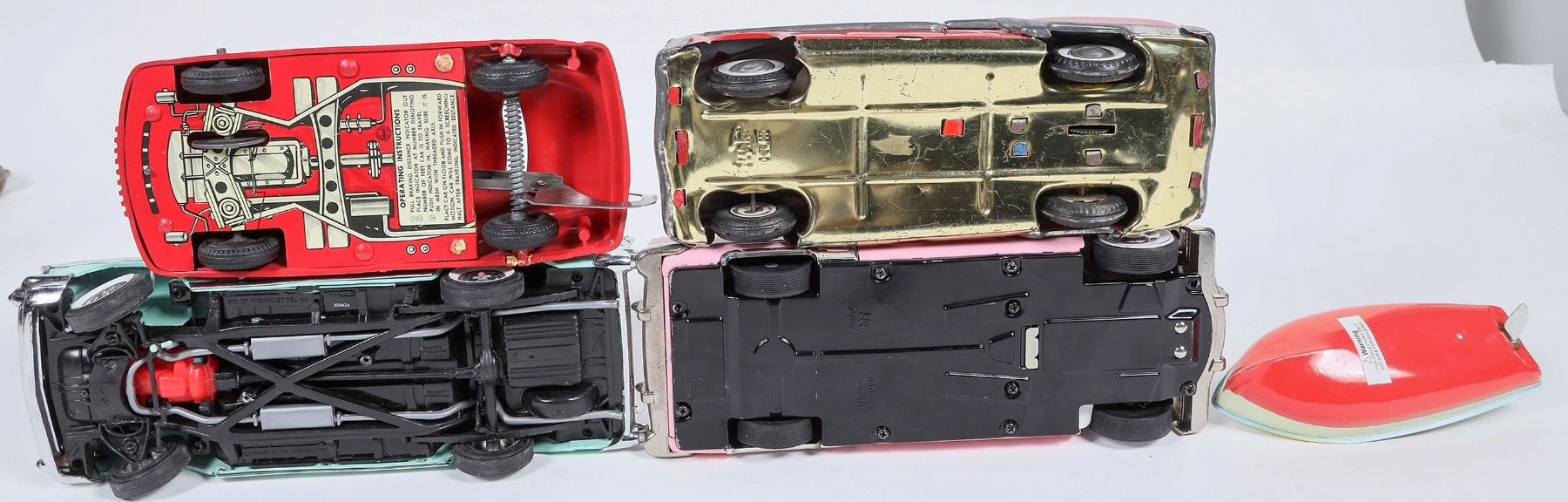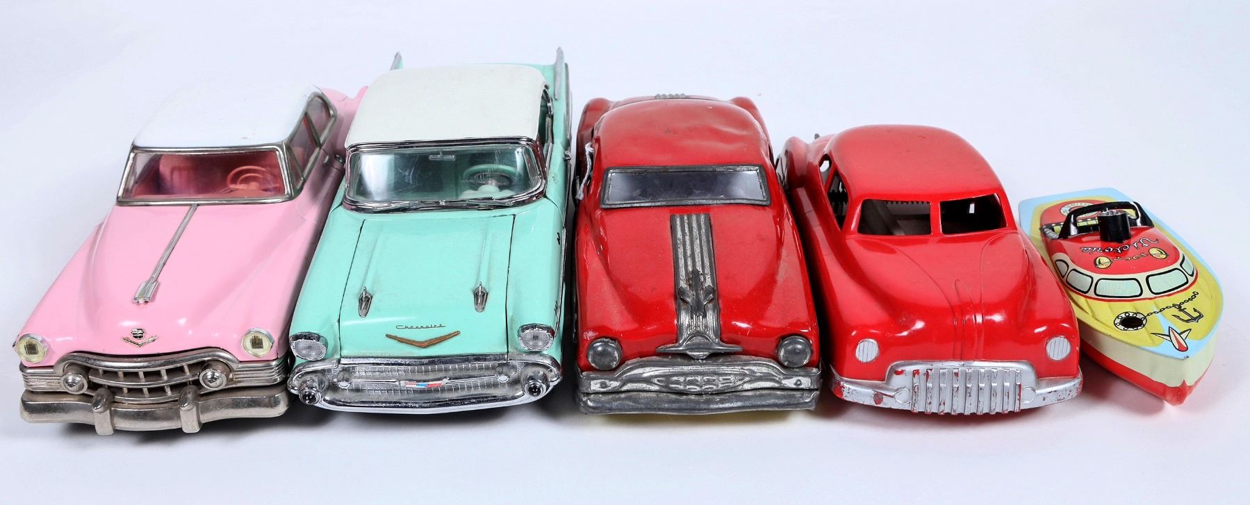 Lot of 6. Various Conditions. Includes: ERTL '57 Chevy, '53 Cadillac, 50's Style Packard Push Car, Victoria Steam Powered Motor Boat, NIB, Complete. Minister DeluxePackard, Steel Pressed, In orig. box. Good to Very Good Condition. 8 1/2” L or less