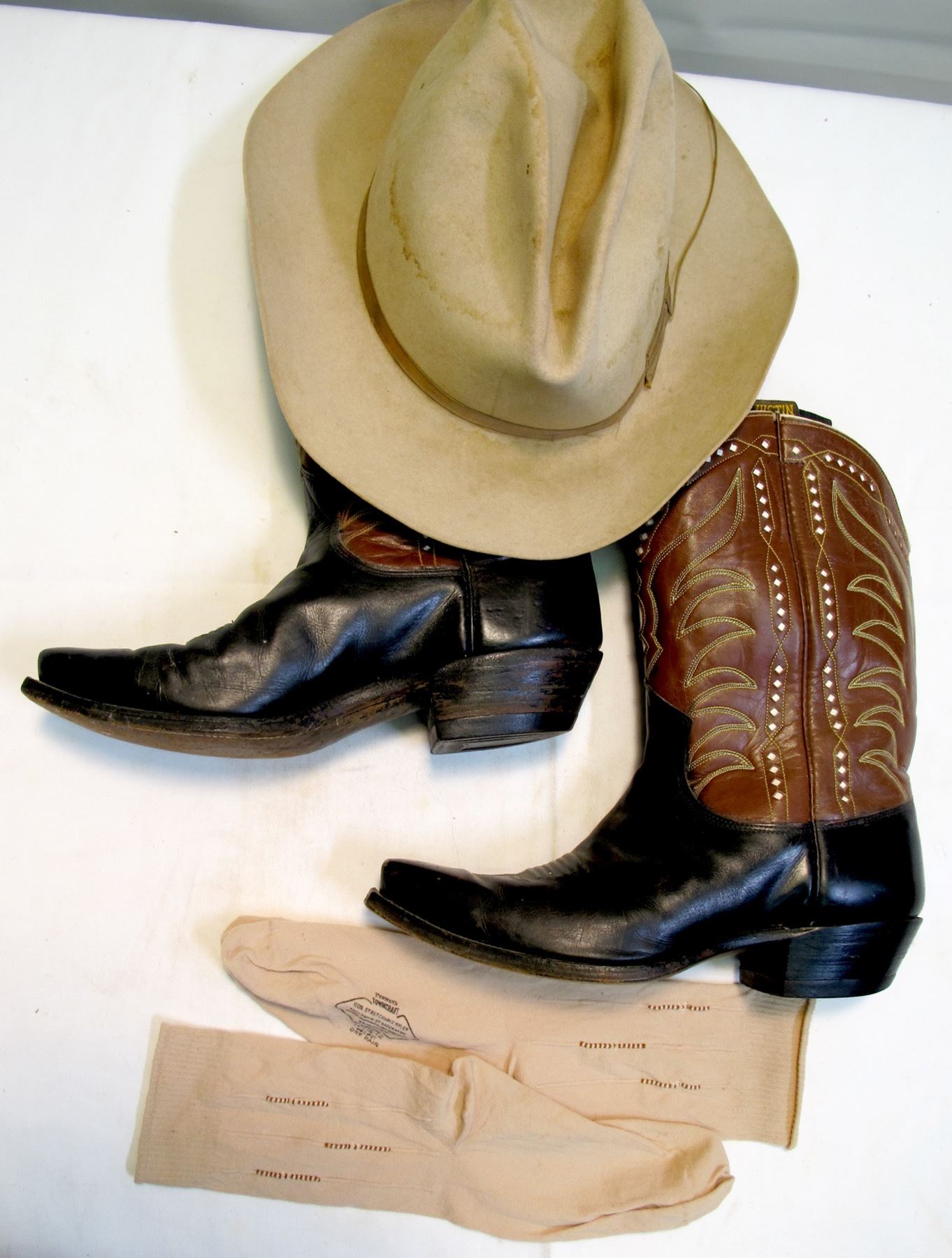 1)Pair of Justin Boots beautiful leather, small enough for women to wear. 2) Vintage Jesse Fulp, OK, c. early 1900's. Hat has some staining. Please inspect. State: Texas City: Fort Worth Date: 1900's HWAC# 84417