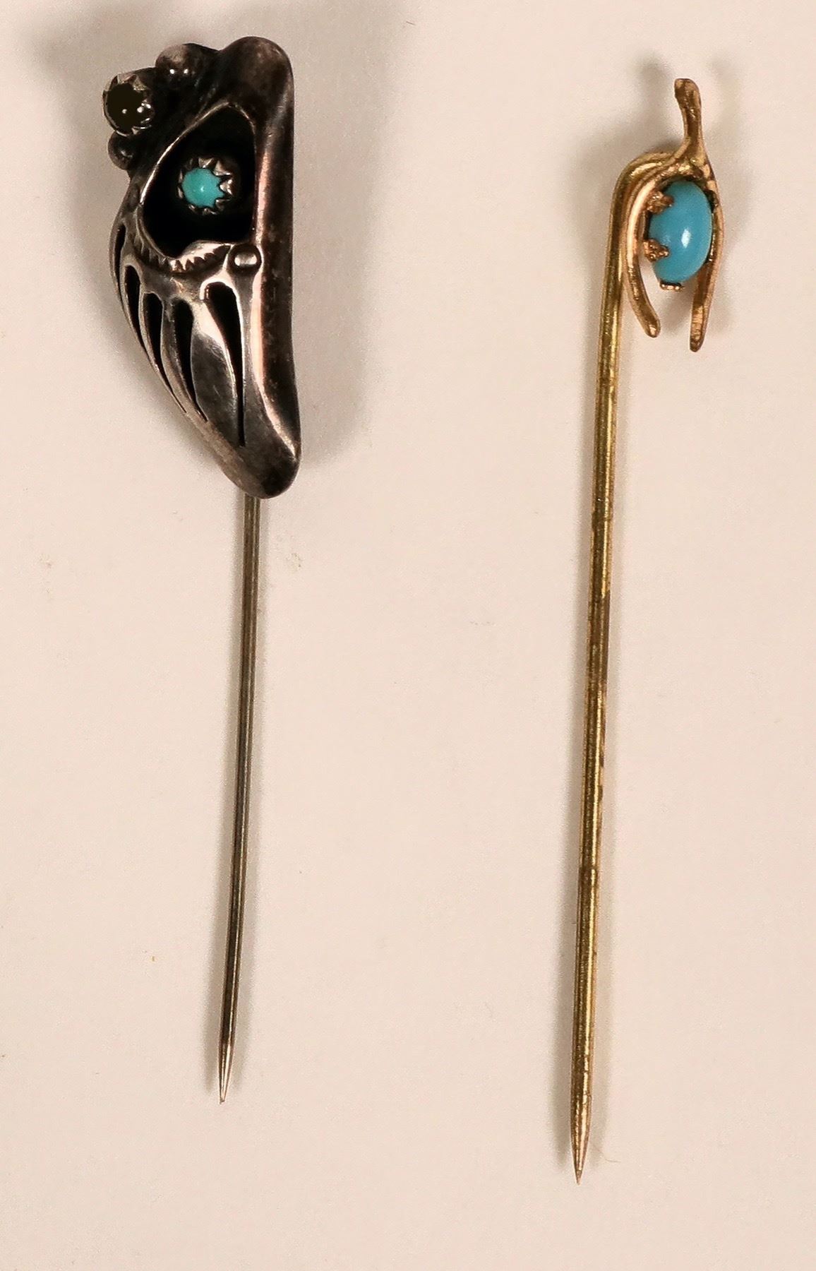 Native American Bear Claw Sterling Silver Pin with small Coral and Turquoise stones and a small gold-tone pin with turquoise stone on western looking gold setting.
