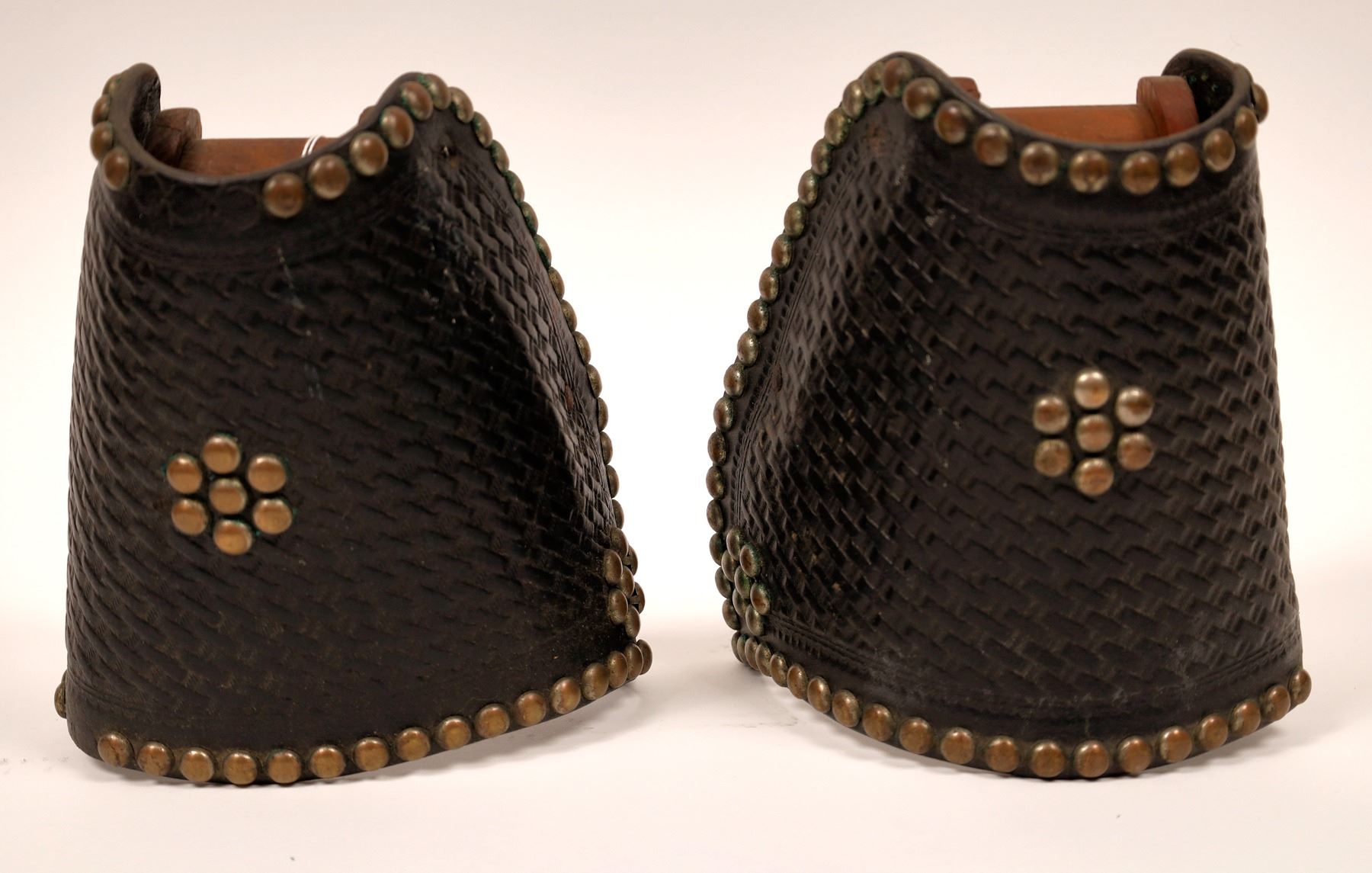 Vintage black tapaderos (stirrup covers) with brass studs. Leather is nicely tooled in a basketweave design, wood stirrups.