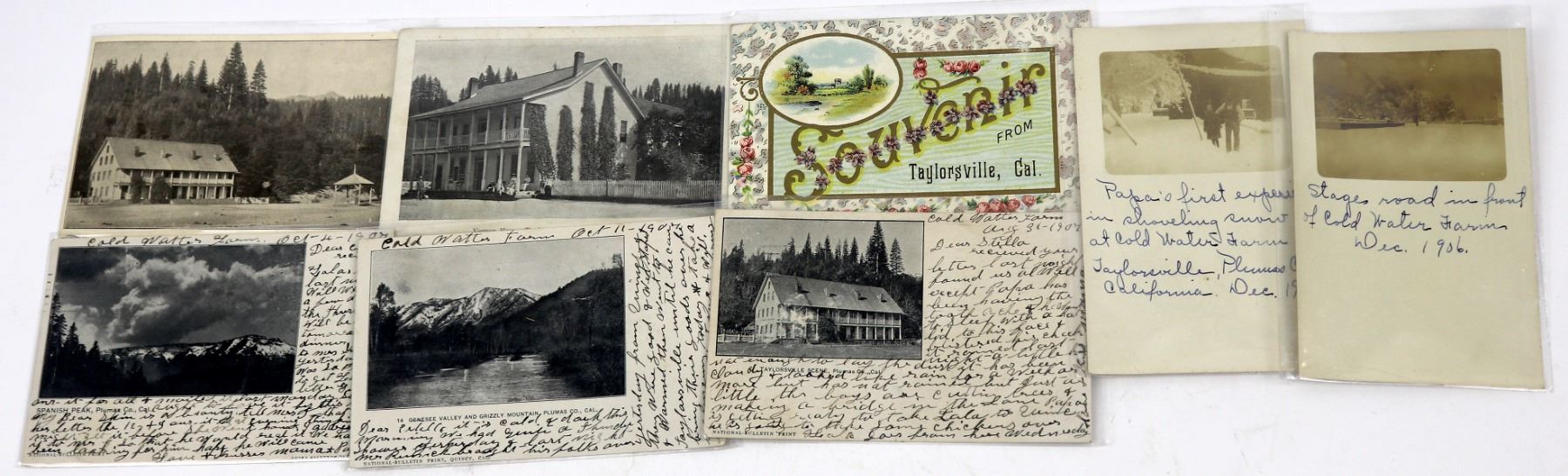 Lot of eight very rare, early 20th century real photo postcards from the Plumas County town of Taylorsville. One is a souvenir cards without photo.