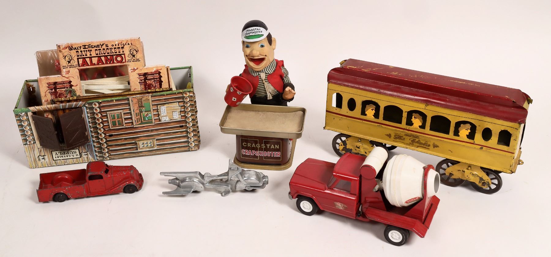Lot of 25 plus. 1. Davey Crocket tin "The Alamo" and a tin "wood fort" unassembled, unk. if complete. 2. Large tin coach car, no name, possible 1900 era. 3. Cragstan "Crapshooter" tin toy. No apparent damage, no dice. Not tested, who uses "D" batteries anymore. 4. Tonka Jeep cement truck. hand crank works and bucket dumps. 5. Metal Masters 1930's era pick up. 6. Metal chrome rocket motorcycle, unk. manufacturer.