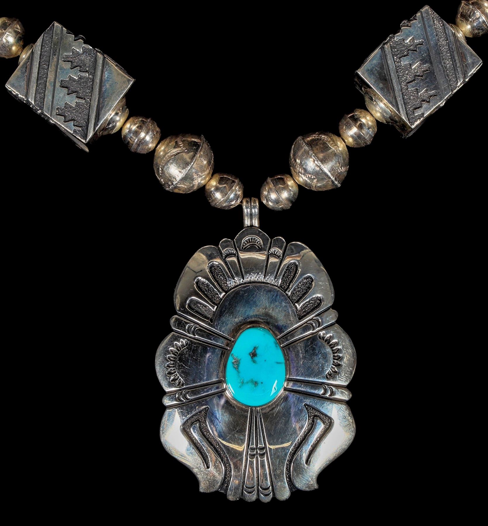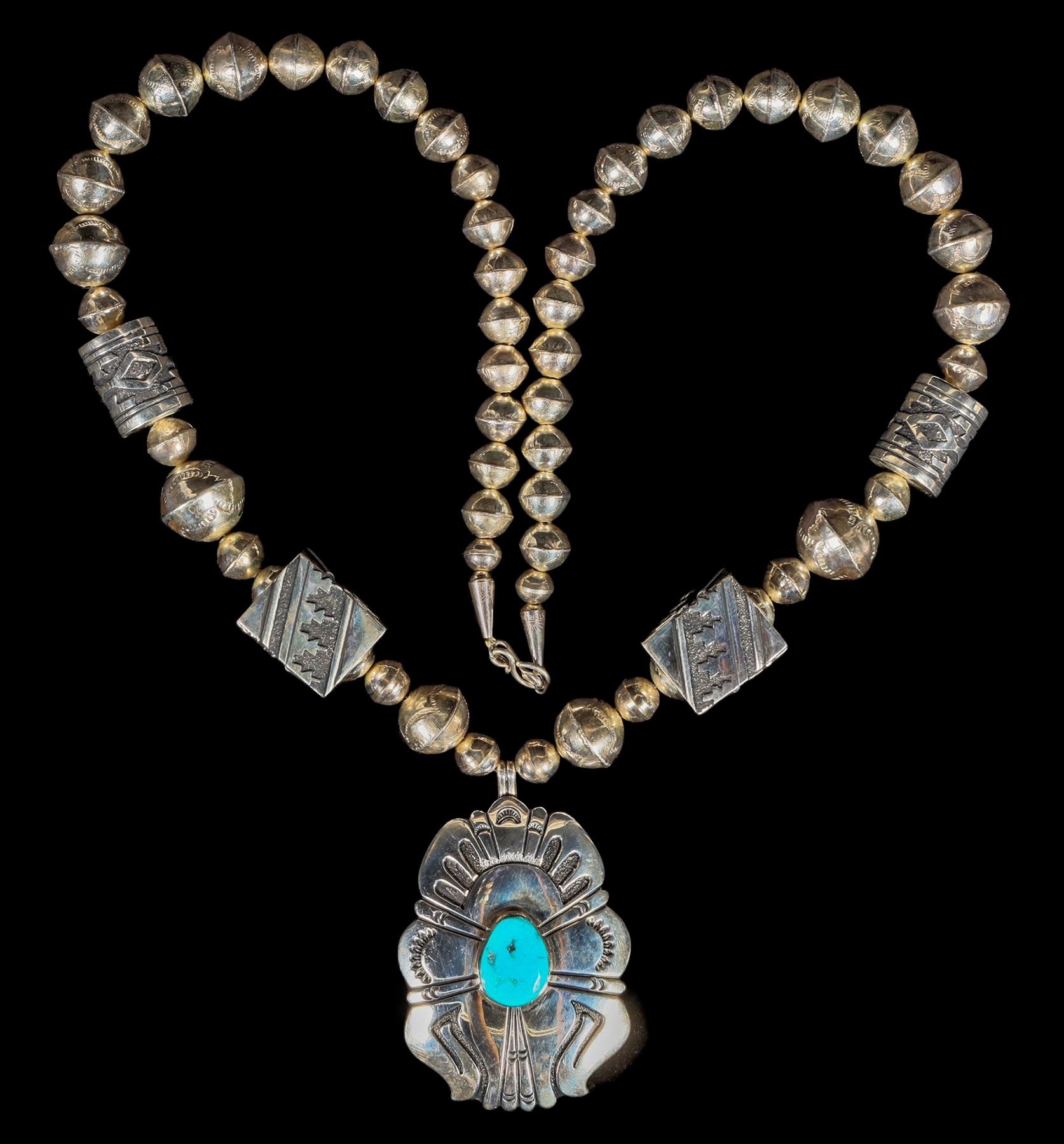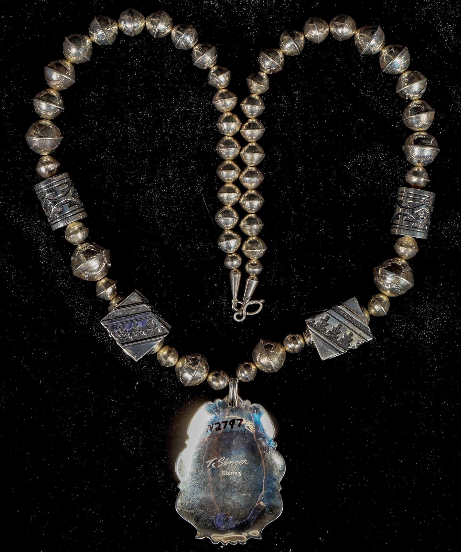 This is a vintage and original Tommy Singer signed necklace, the necklace has both sterling barrels and square blocks that were trademark designs used by Tommy and still used today by the family, the pendant at the base measures 2 3/4" tall by 2" across with a single Morenci turquoise spot and hangs at about 17", the piece is hallmarked on the reverse of the pendant, a great collector piece for any Tommy enthusiast.