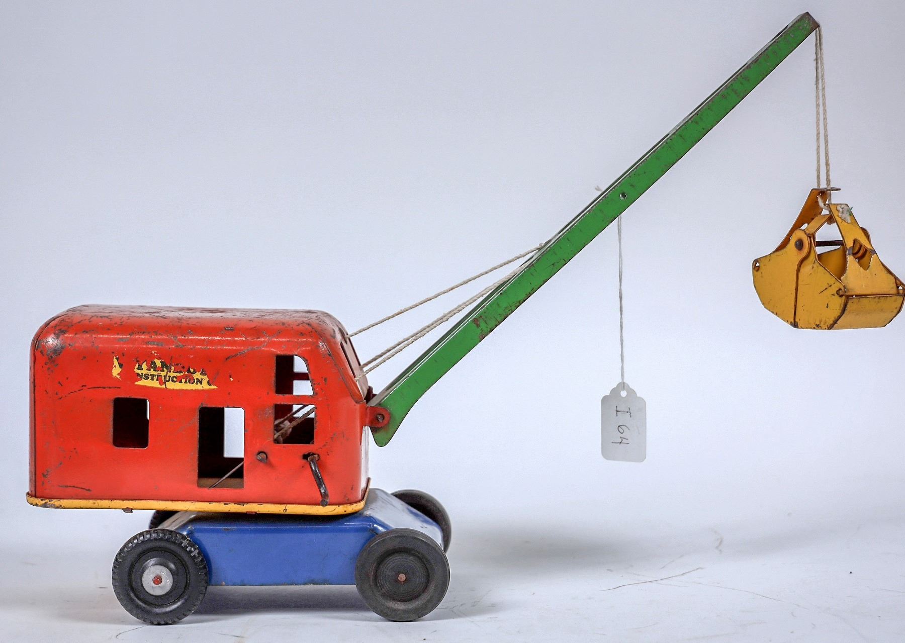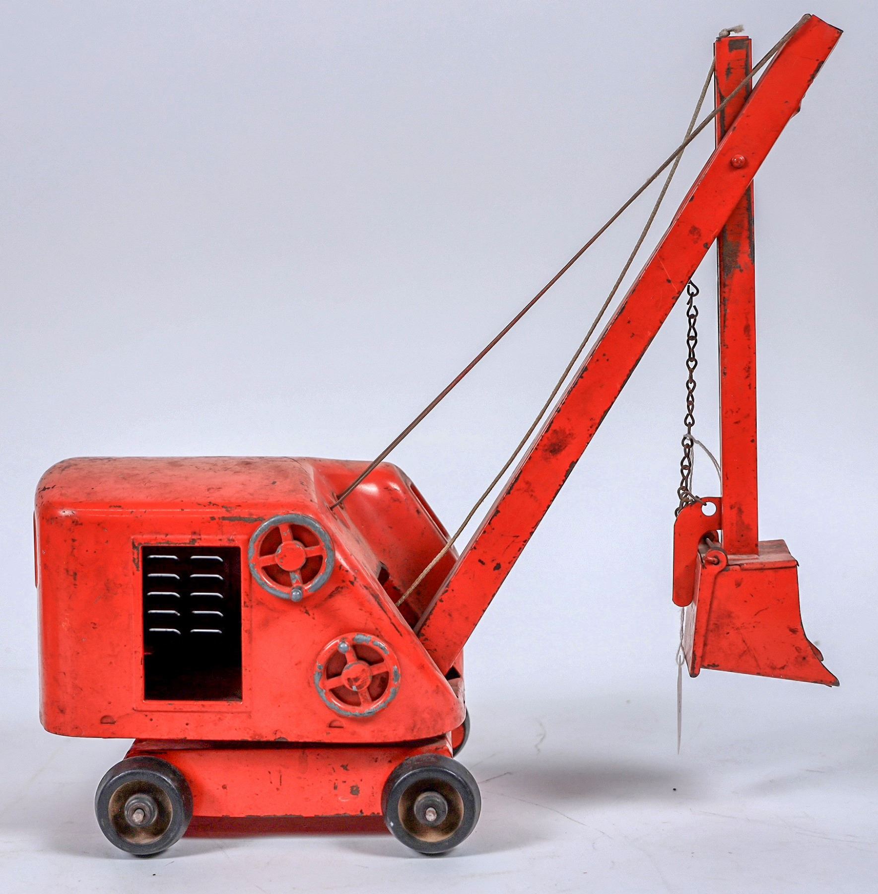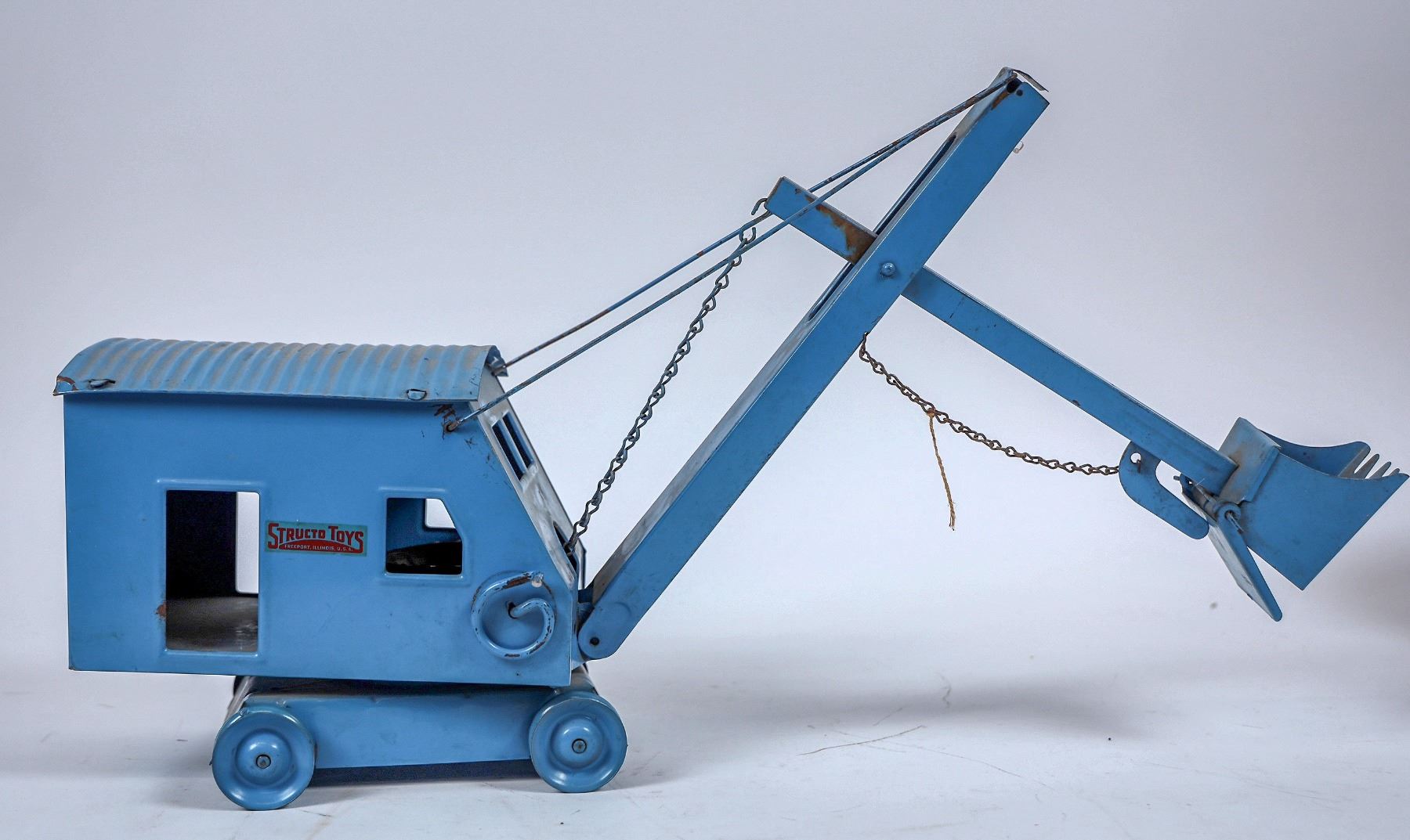 Lot of 3. 1. Wyandotte red/blue jawed steam shovel. Good cond. does have play wear. Boom and bucket operate. 2. Structo Toys, Blue steam shovel bucket, operates, some play wear, missing tracks. Overall very good cond.3. Structo steam shovel, bucket , red. operates, show play wear, tires in very good condtion overall VG. All three measure 16 X14" with booms partially raised and buckets pulled toward cab.