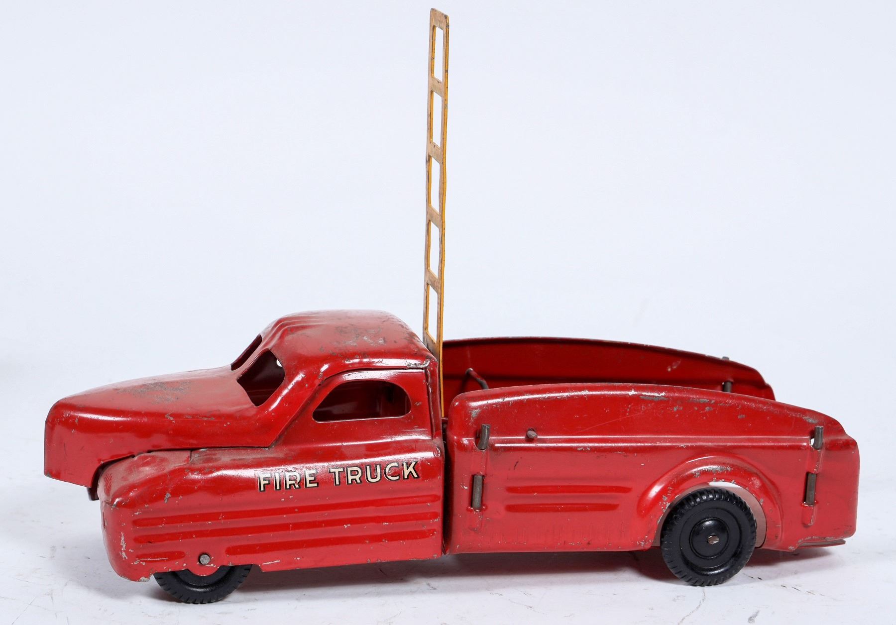 Wyandotte Fire Truck. Red/Yellow. One ladder. Missing Grill. Good Condition. Blue Pressed Steel Tractor. Possibly Marx or Structo. Light Play Wear. No Graphics. 12’ L or less