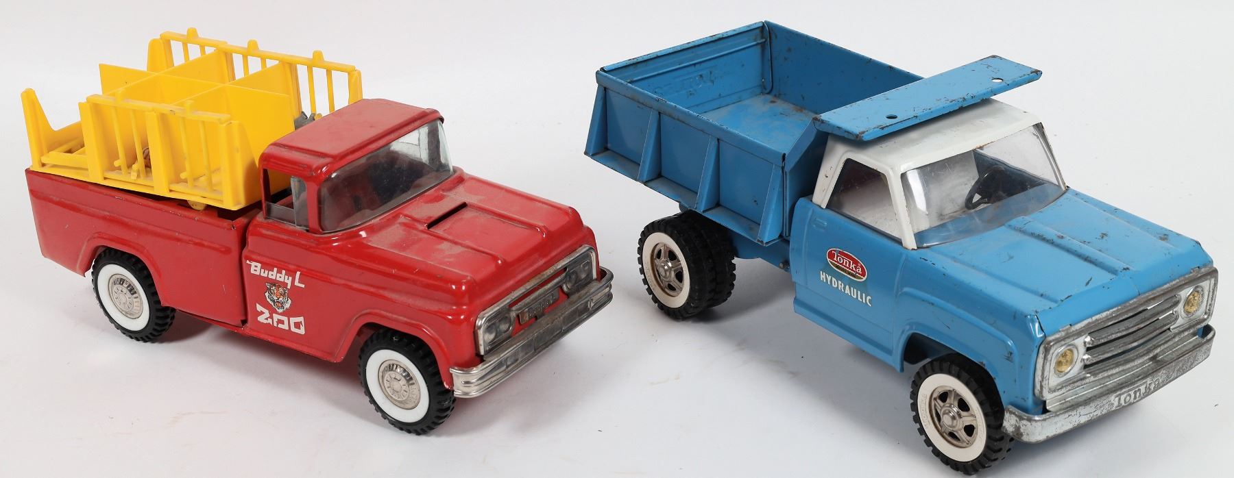 A) Vintage blue and white Tonka hydraulic dump truck. Made c. 1960s. Still in working condition. Some scratches and rust. Approx. 13.75 inches long and 6.25 inches tall.