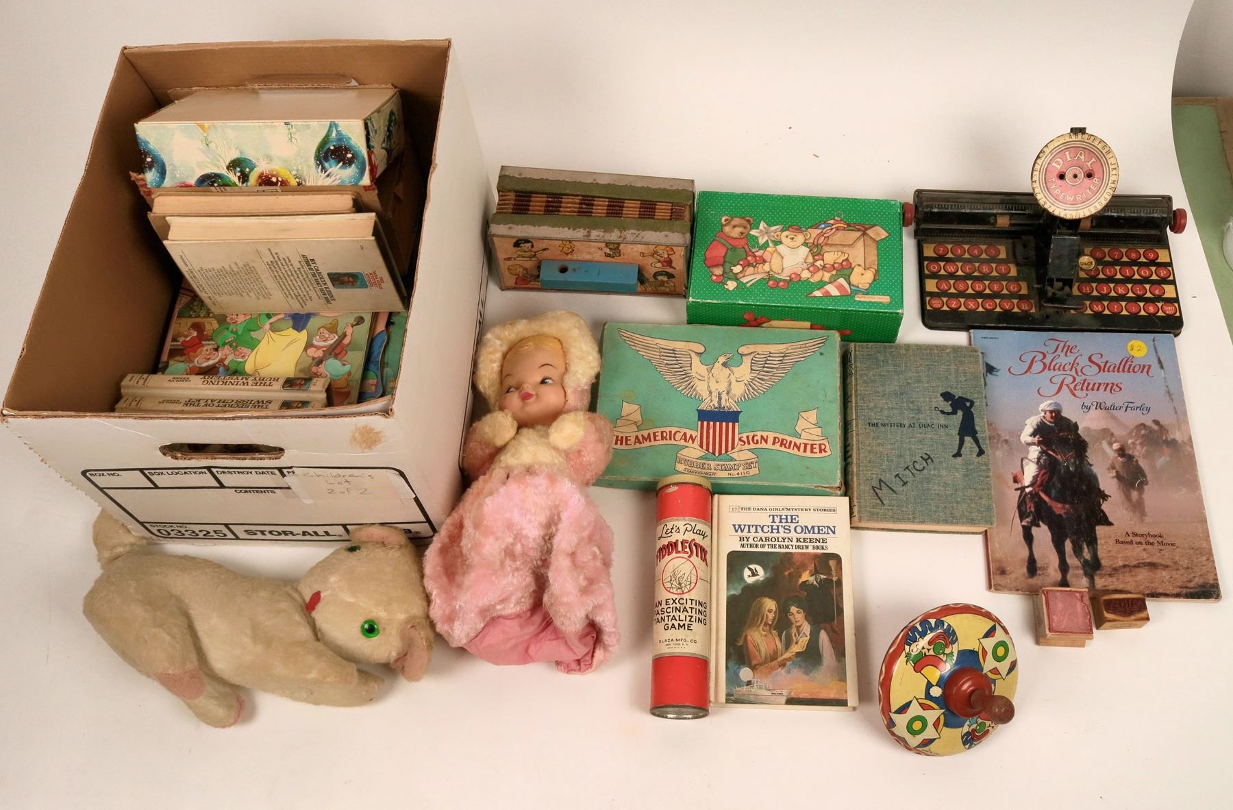 Collection of more than 20 vintage toys and children's books, c1930s-1950s. Includes: Xylophone Playing and Singing book, copyright 1939 Cole Corp., Chicago, Ill. Vintage child's accordion toy, missing some keys but still makes sound. 1950s Dial Typewriter toy from Louis Marx and Company, appears to work. Vintage 14 inch stuffed cat by Sterling Best Ever Prod. Brooklyn, NY. 1950s baby doll zippered pajama holder. Rubber Stamp Set by StamperKraft. Metal top. Fiddlesticks. Books- copyright 1930, Nancy Drew series, The Mystery at Lilac Inn, Carolyn Keene; copyright 1940, The Disappearing Floor, Franklin W. Dixon; copyright 1970s, four books from series The Dana Girls Mystery Stories, by author of Nancy Drew, Carolyn Keene, and more. Several cardboard and wooden puzzles from the 1980s. Date: 1930s-1950s Country (if not USA): State: City: Provenance: John Reynolds Collection