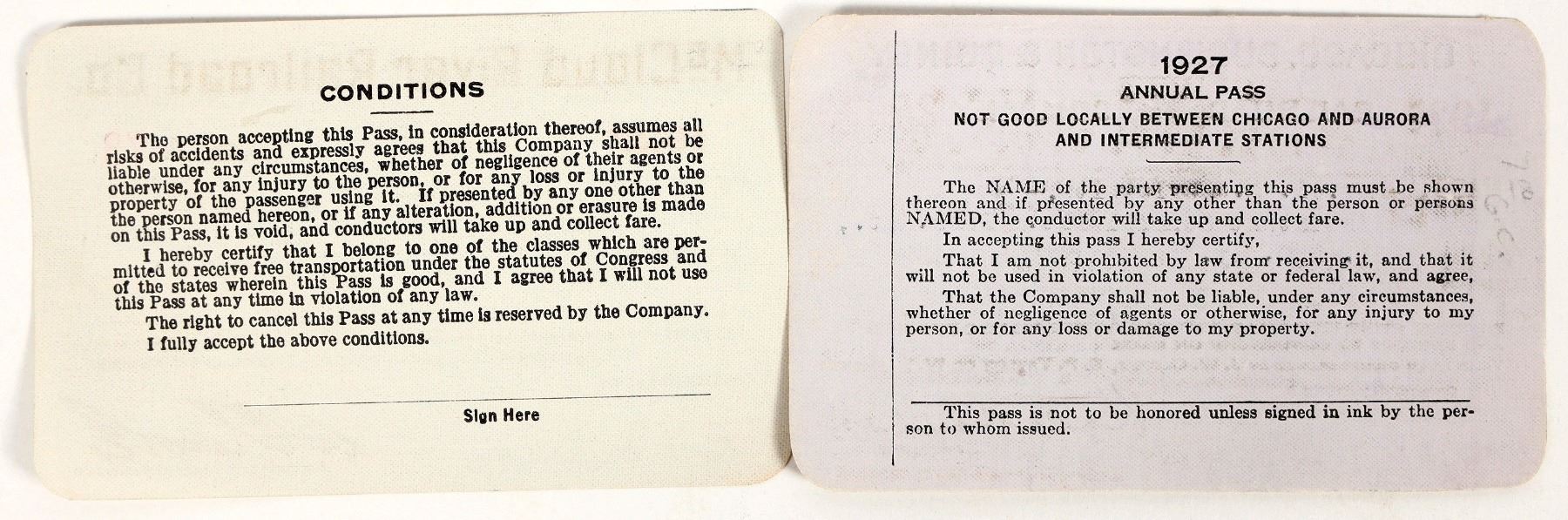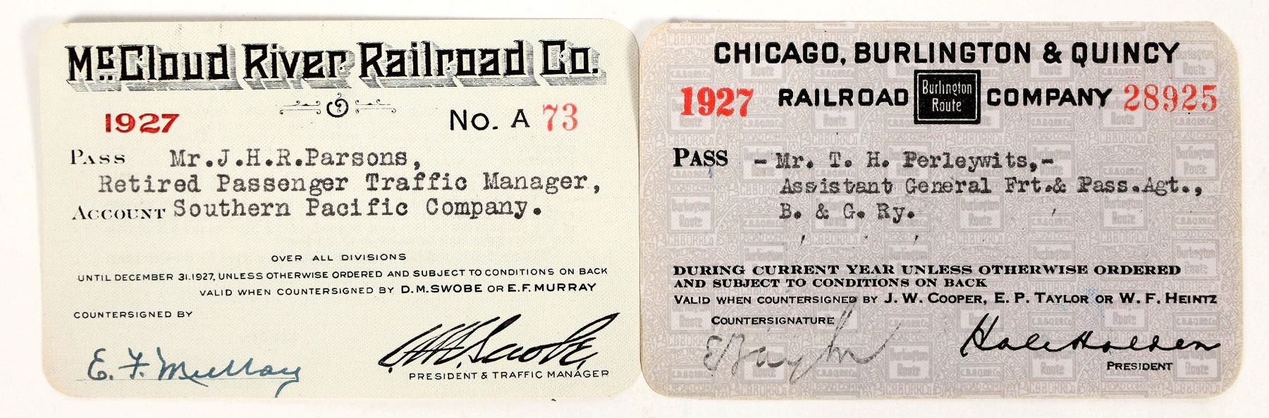 Two railroad passes, both dated 1927. Includes a pass for the McCloud River Railroad Company and a pass for the Chicago, Burlington & Quincy Railroad Company's Burlington Route. Each 4"x2.5", both in good condition; see photos.