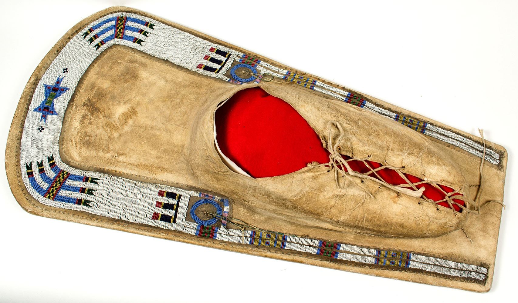 Vintage Ute wood board, tanned elk hide, glass beads, red wool trade cloth. 38" long 17.5" at widest. Amazing piece! Not authenticated, however, a prize cradleboard. Date: c.1880's Location: HWAC # 42076