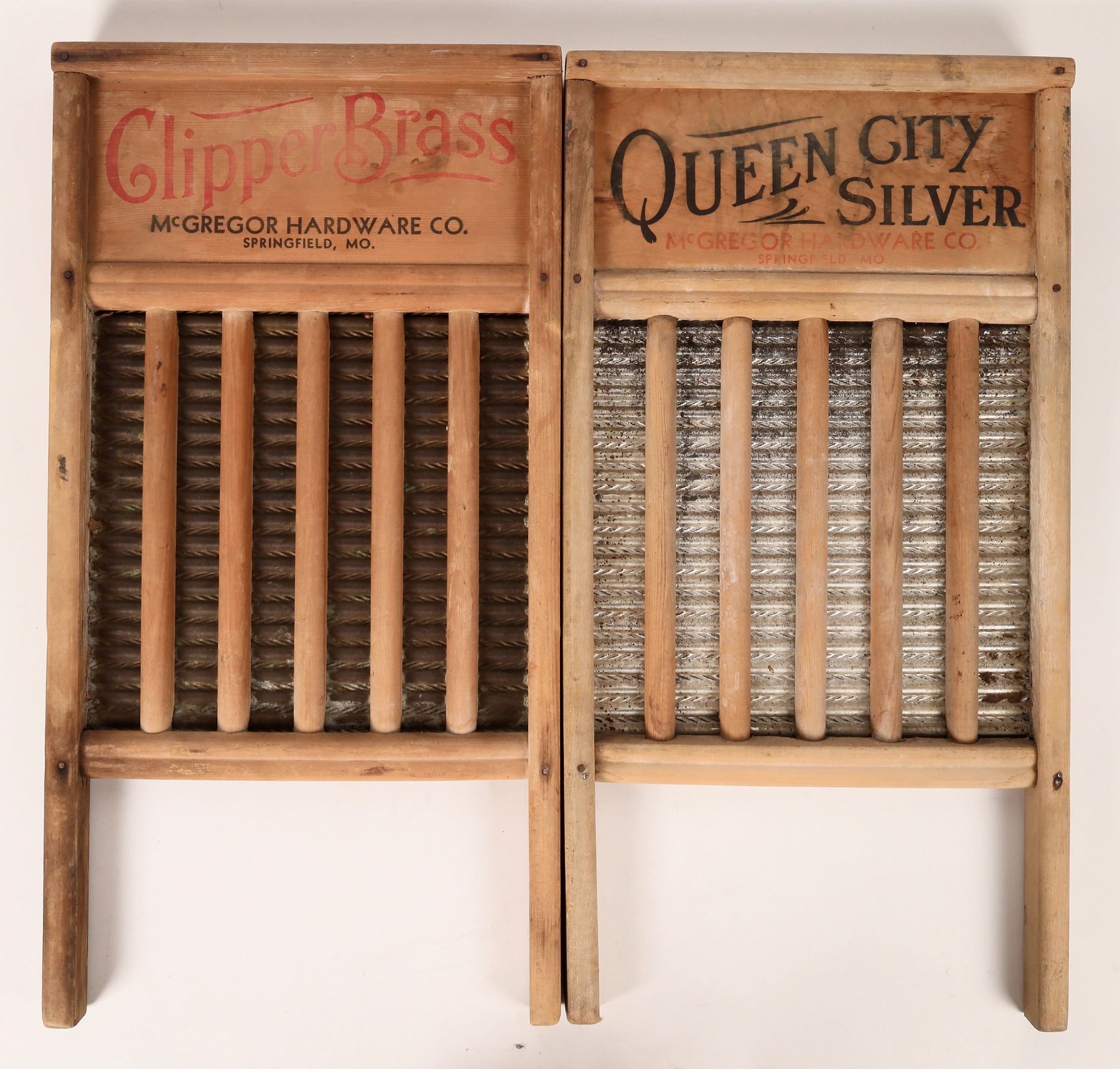 Lot of two vintage washboards for decorating your laundry room: 1) Queen City Silver from the McGregor Hardware Co. Springfield Mo. 12 inches wide, 24 inches tall. 2) Clipper Brass McGregor Hardware Co. Springfield, Mo.; 12 inches wide, 24 inches tall. Missouri Springfield