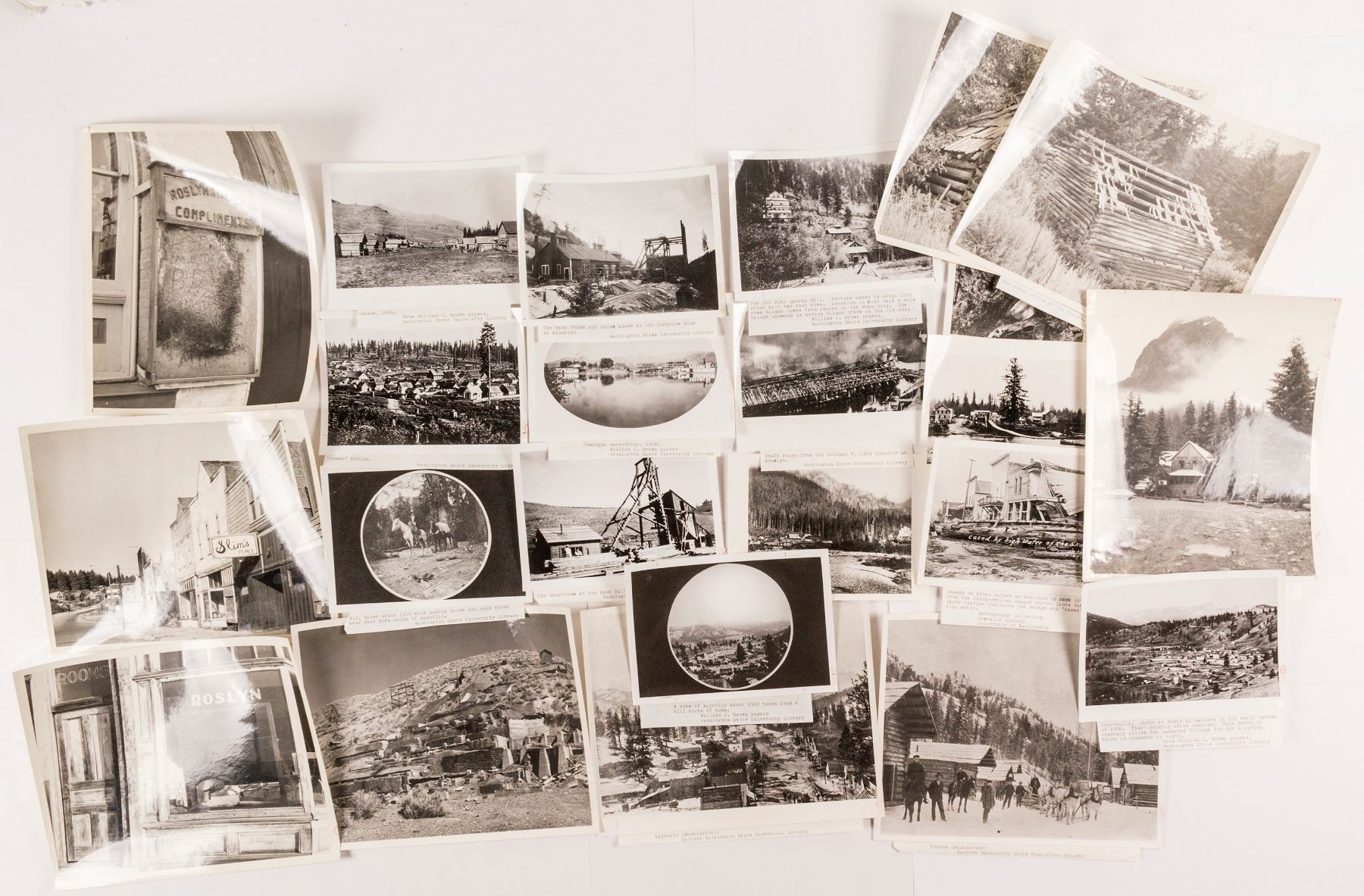 A collection of 5" x 7" and 8" x 10" black and white photos featuring Washington mining subjects including Suprise Mine, Chewas, old buildings at Roslyn, Republic and more.