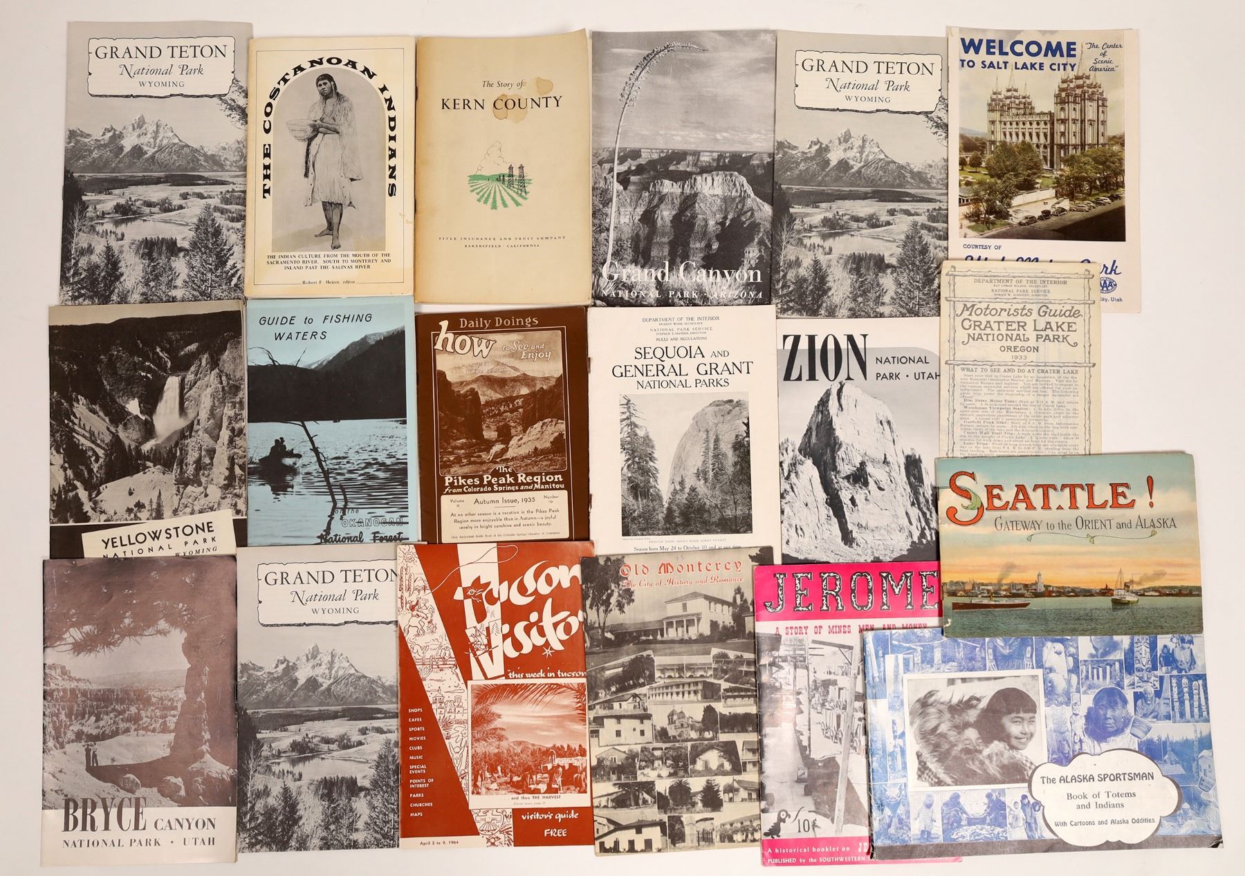Wonderful collection of travel guides and tourist brochures from the 1920s and 1930s. Photographic brochure "Seattle! Gateway to the Orient and Alaska," 1924. Tour guides to Grand Canyon National Park, Grand Teton, Yellowstone, Okanogan National Forest, Pike's Peak Region, Sequoia and General Grant National Parks, Zion, Bryce Canyon, Crater Lake (1933), Tucson Visitor (1964), Old Monterey, Jerome, Arizona, Salt Lake City. And three books: The Costanoan Indians; The Story of Kern County; The Alaska Sportsman: Book of Totems and Indians.
