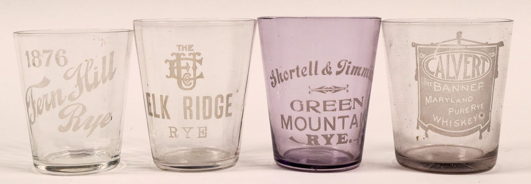 This group of vintage etched shot glasses all have a place name as the whiskey name. Elk Ridge Rye; Fern Hill Rye; Green Mountain Rye (deep purple); Maryland Pure Rye.
