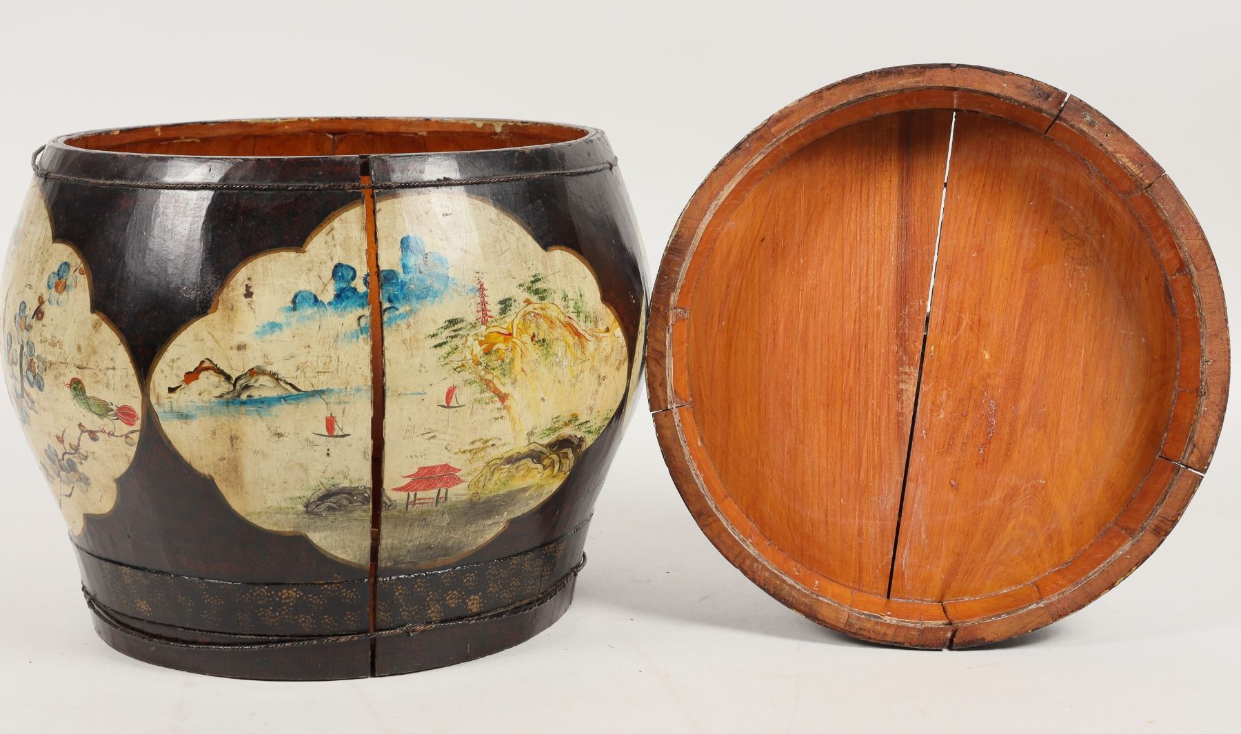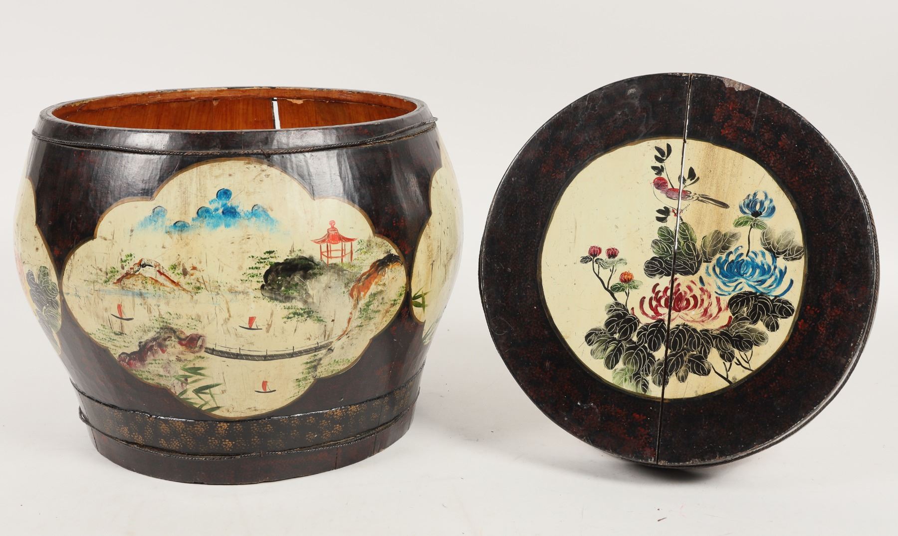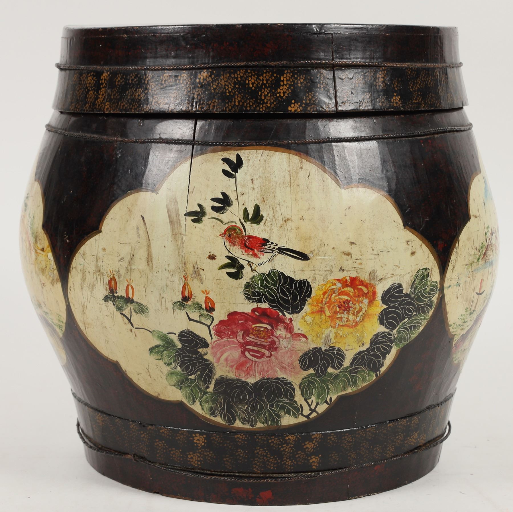 Vintage Chinese hand painted wooden rice barrel/basket. Used for storing rice. In need of repair with significant crack on the main body and lid, chipping present, please inspect. Diameter measures about 11". Height of 10" without lid, 12.5" with lid.