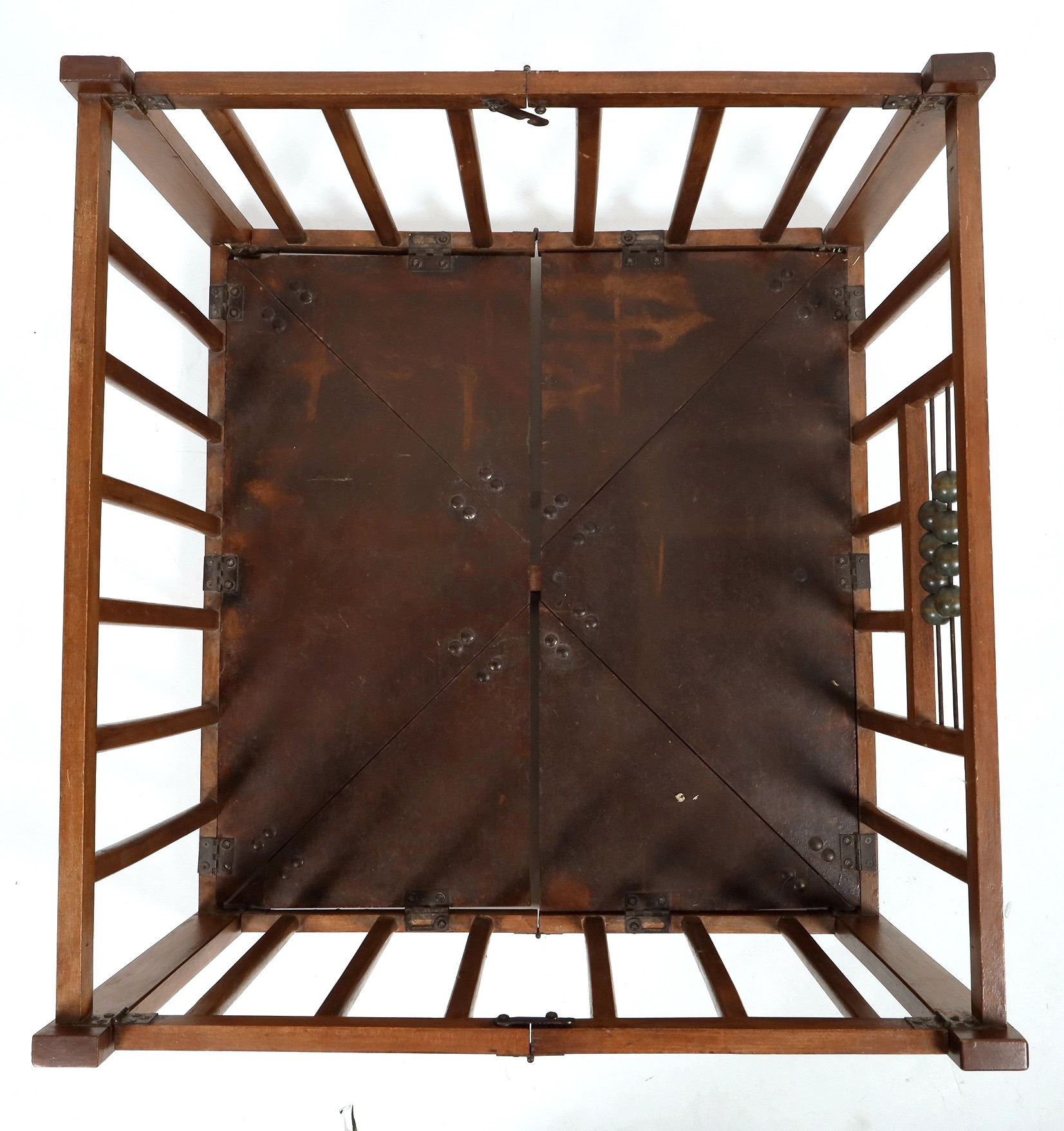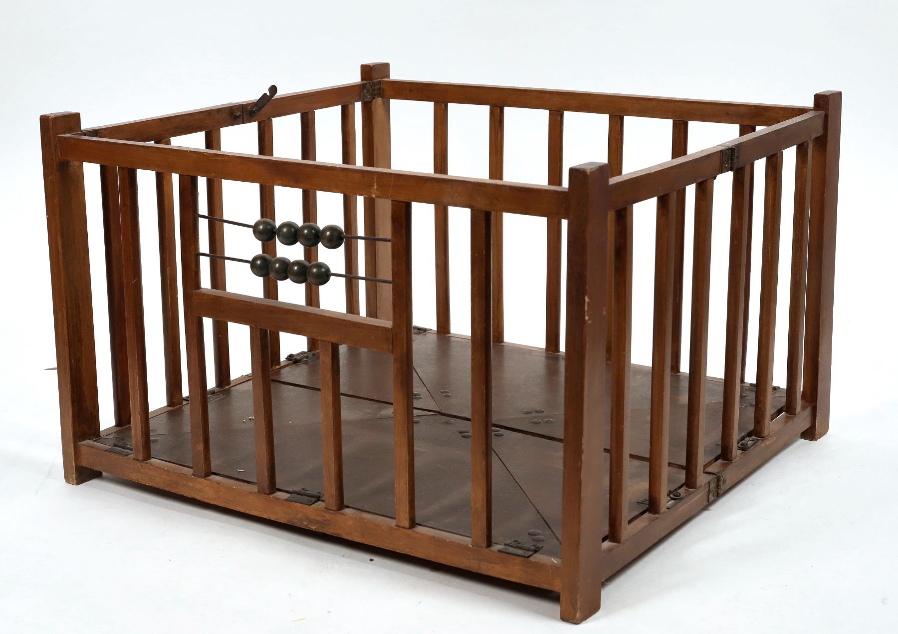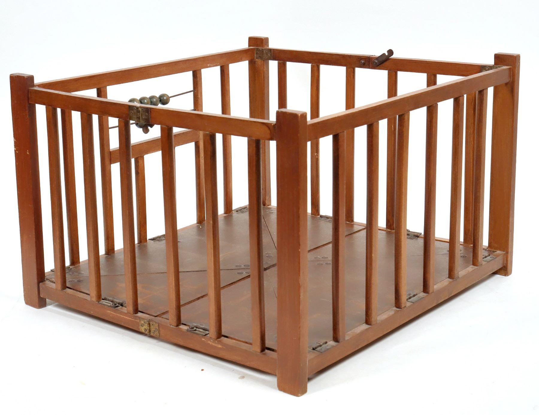 Vintage wooden doll's playpen, c1940s-50s. Built sturdily with metal hinges and clasps that allow the unique six-piece floor to fold upwards until the playpen is flat for storage. Stands on its own when folded. Two rows of colored wooden beads on wires. Measures approximately 21" x 19.5" x 13" tall. No maker's mark.