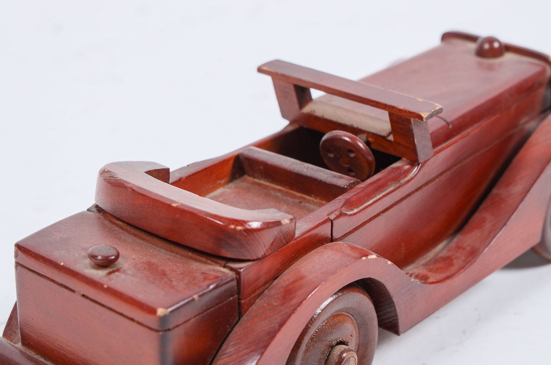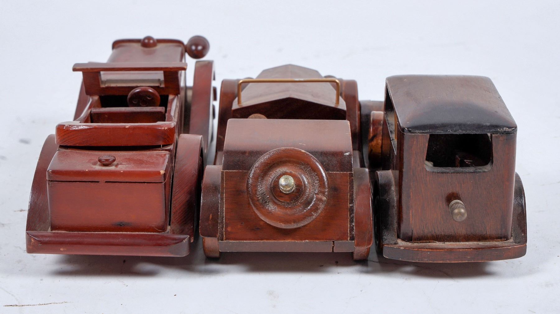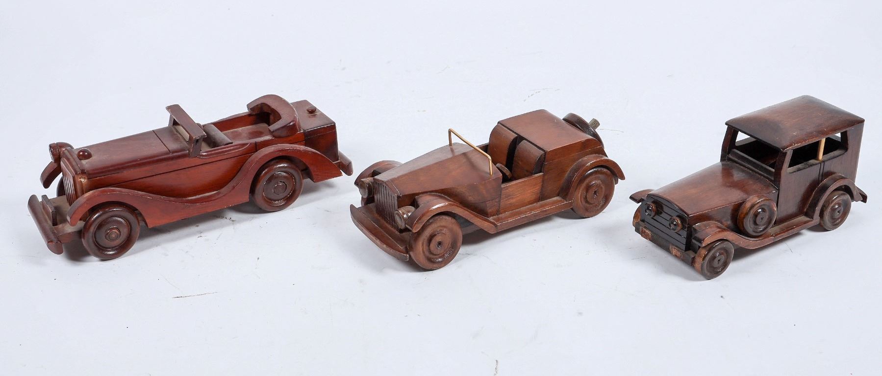 Lot of 3. George Good Corp. wooden music box cars. All parts are solid wood, except for the music box. All three exteriors are in very good cond. except for the hardtop Model T roadster. Model T has a broken right front tire and the front bumper broke off but is with the car for repair. The other two :convertible w/ spare works plays "King Of The Road" and the other convertible both in VG cond and the music box works, but will need cleaning. each 12 1/2 x 4"