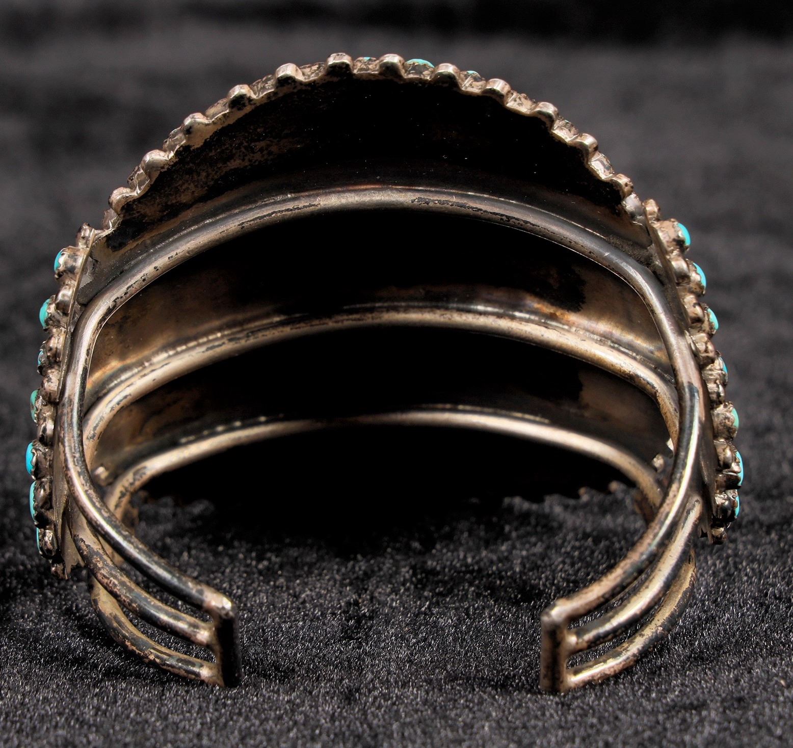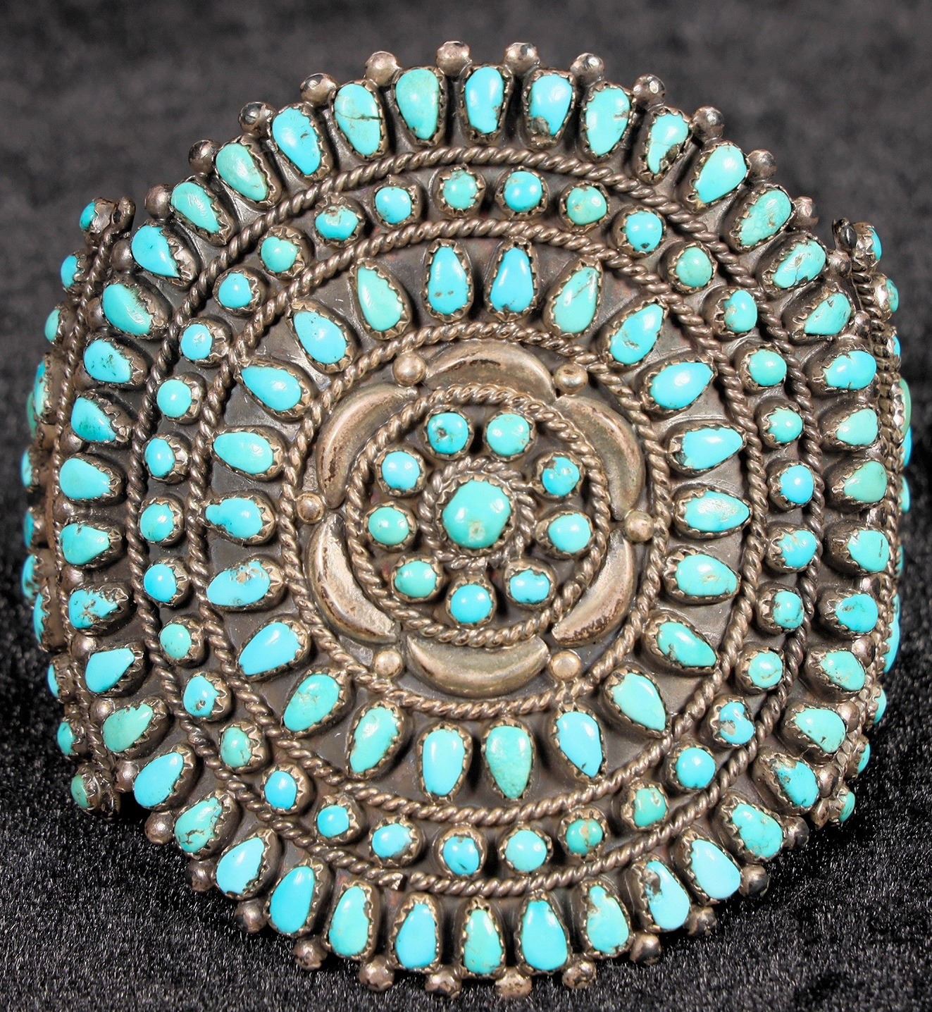 This is a vintage Zuni made turquoise cuff comprised of 132 pieces of turquoise combining the use of both petite point and small circular turquoise spots, the circular face of the cuff is 3" in diameter with a 1 ¼" opening and 2 .5 " at the inside centerpoint.