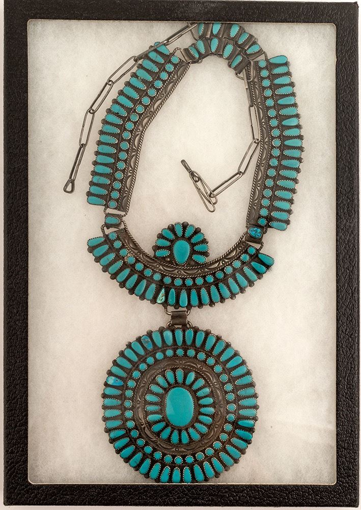 Early Zuni petite point squash blossom necklace in frame. Turquoise and silver. Top portion approx 8", bottom approx 3.75". Very nice condition and an eye catcher. Consigned by The Cowboy Connection in Livingston, MT. State: City: Date: ID# 49250