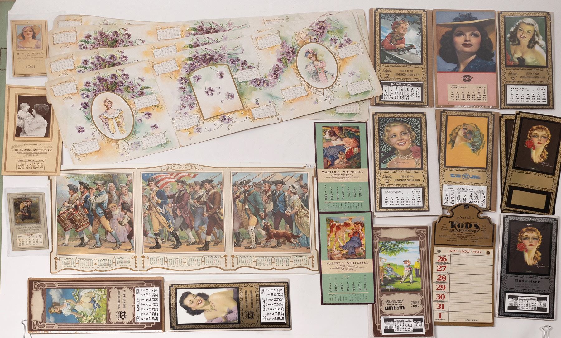 Lot of 20. largest measures 12X30" 1. Gas station calendars, "Pretty Girl Series", that would be found on Route 66 1947-65 9most are still sealed and appear new condition). . 2. Four, three are in near new condition.Tri-fold cardboard calendar for 1900. Grand Union Tea Co Brooklyn, N.Y. 3. Smaller calendars 1925-50. United Life Insurance Concord, N.H., Dentist Pittsburg PA., The Symons Milling Co. Adana, OH. all in near new condition. State: City: Date:1900-60's Provenance: Stuart Mackenzie Montana Ephemera Collection