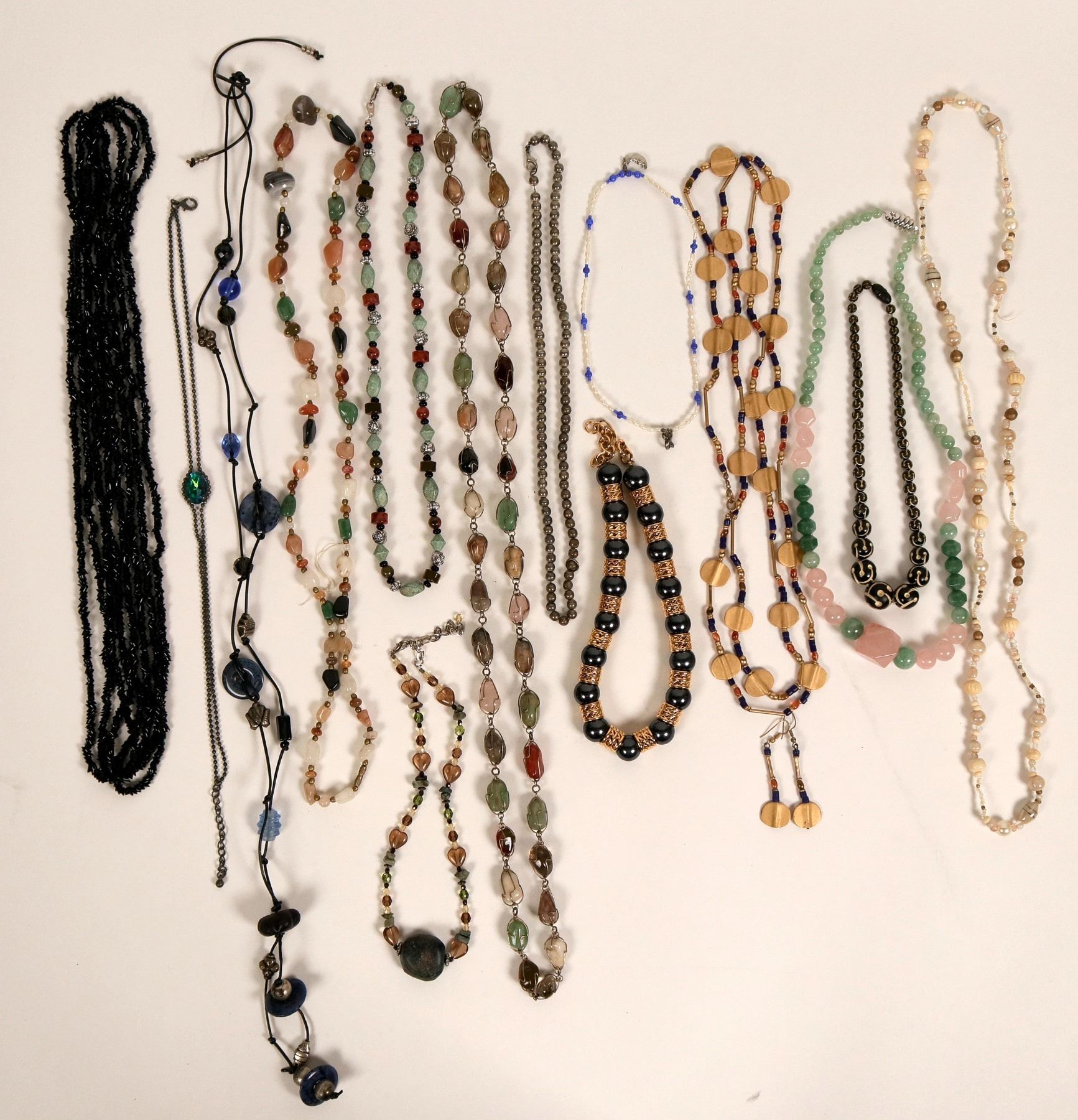 An assortment of costume jewelry about 30 beaded stone necklaces. Refer to photo