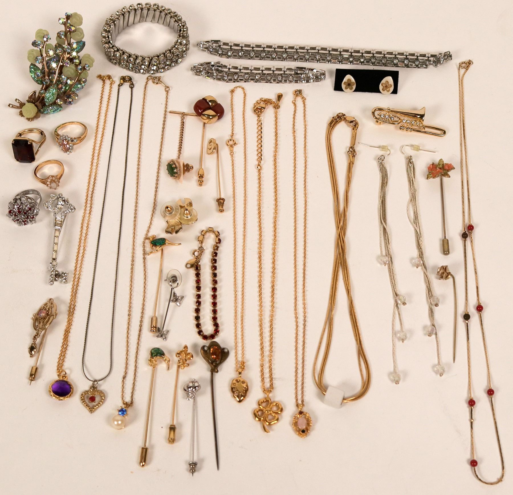 A collection of about 36 pierces consisting of necklaces of Jade, Austrian Crystals,faux Rhinestones and an arrayof stick pins.