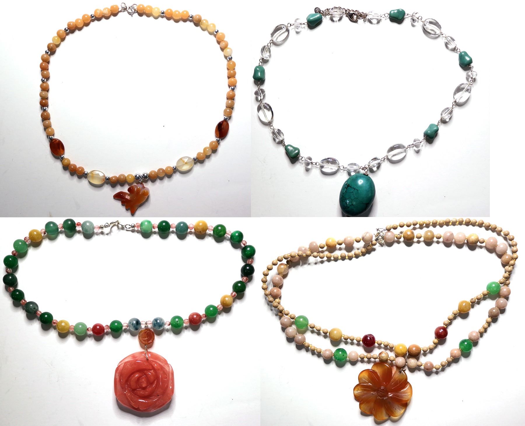 About 5 are included in this lot. Carnelian/Jade Rose beaded chain and Rose Pendent Genuine gemstone necklace. Red Agate flower Agate/Jasper beaded necklace with Genuine gemstone pendent. 18" Agate necklace in warm tones. Sterling Crystal and turquoise necklace with an oval genuine turquoise stone.