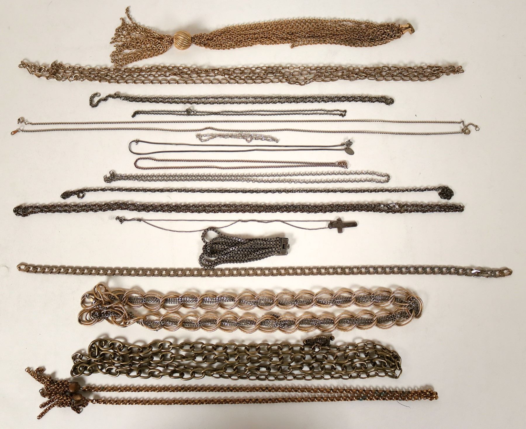 An assortment about 16 of various open link chains of varying lengths and styles. Refer to photo.