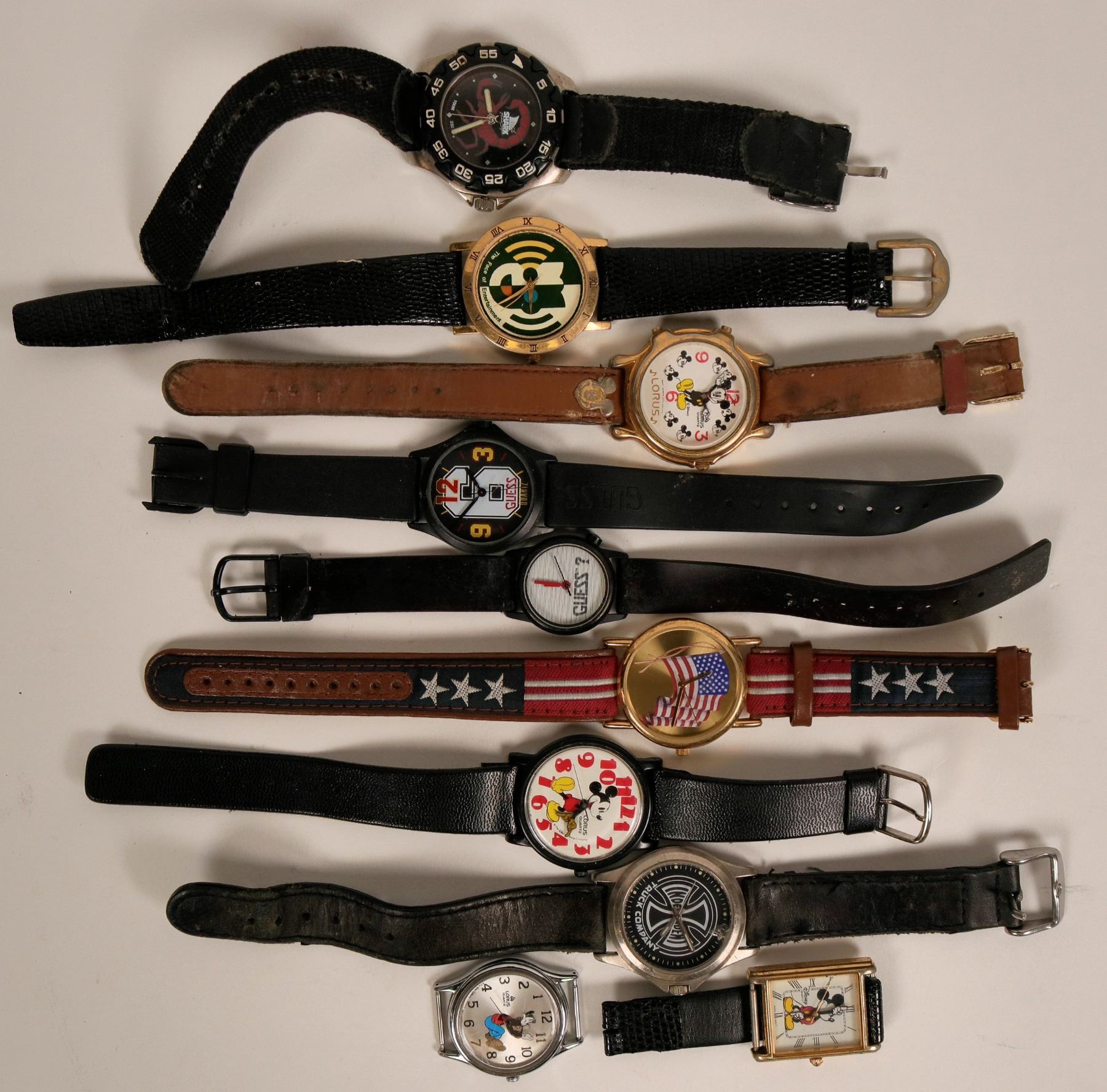 A collection of watches 10 dated from 1980's to 1990's. Of special note that their are Guess, Disney characters, Independent Truck company among other brands. Most need some type of repair.