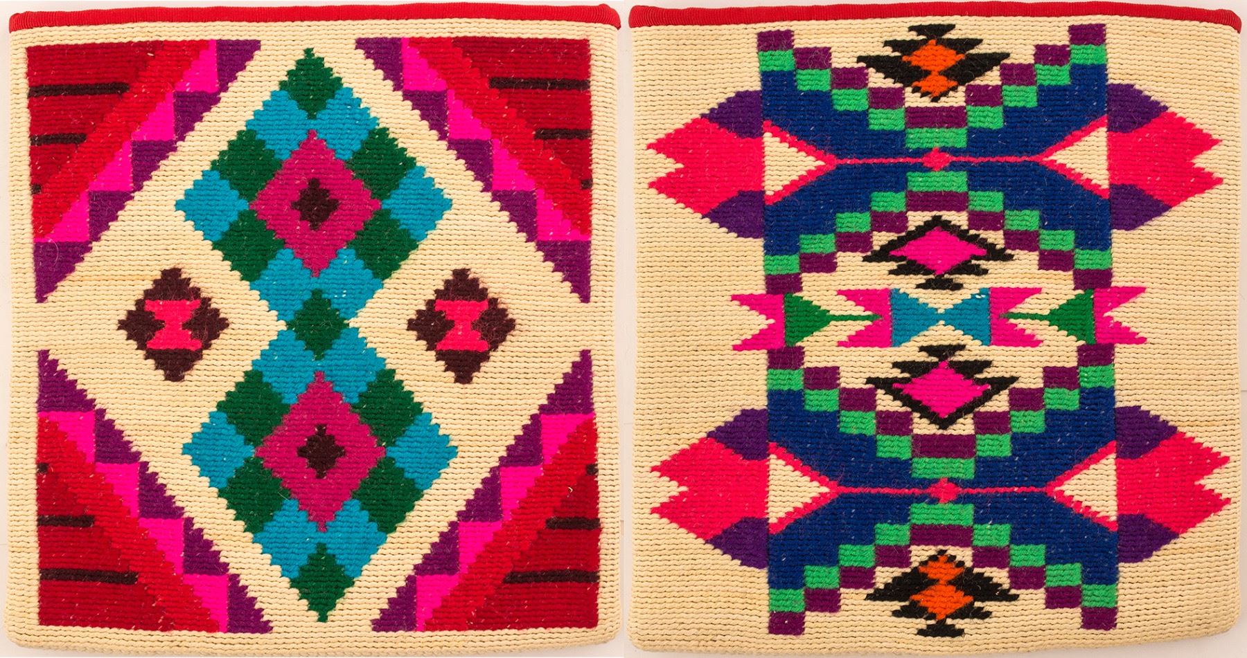 Woven corn husk and yarn bag by Viola Morris. This bag is new, never used. Stitching is different on each side. 9" x 8.5". Viola Morris was a very well known Nez Perce artist. Nez Perce traditionally fashioned decorated bags and clothing. Twined bags, frequently called cornhusk bags, are an art unique to indigenous groups of the Plateau region of North America. Weavers use the false embroidery twining technique to create patterns and motifs. This is done during the actual weaving, by wrapping a strand of decorative material (cornhusk, yarn) around the outside weft as it crosses over the warp. The later bags of the late nineteenth and twentieth centuries are almost always completely covered in false embroidery because they were used more as handbags. One of the most characteristic features of these bags is the distinction of two different designs on each face of the bag. The weavers were thus creating two different designs at once, and because of this no two bags look alike. Date: Location: Idaho HWAC# 56820
