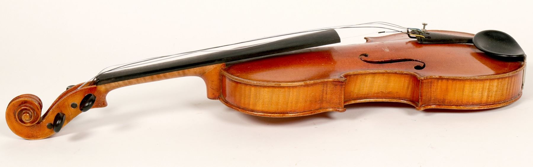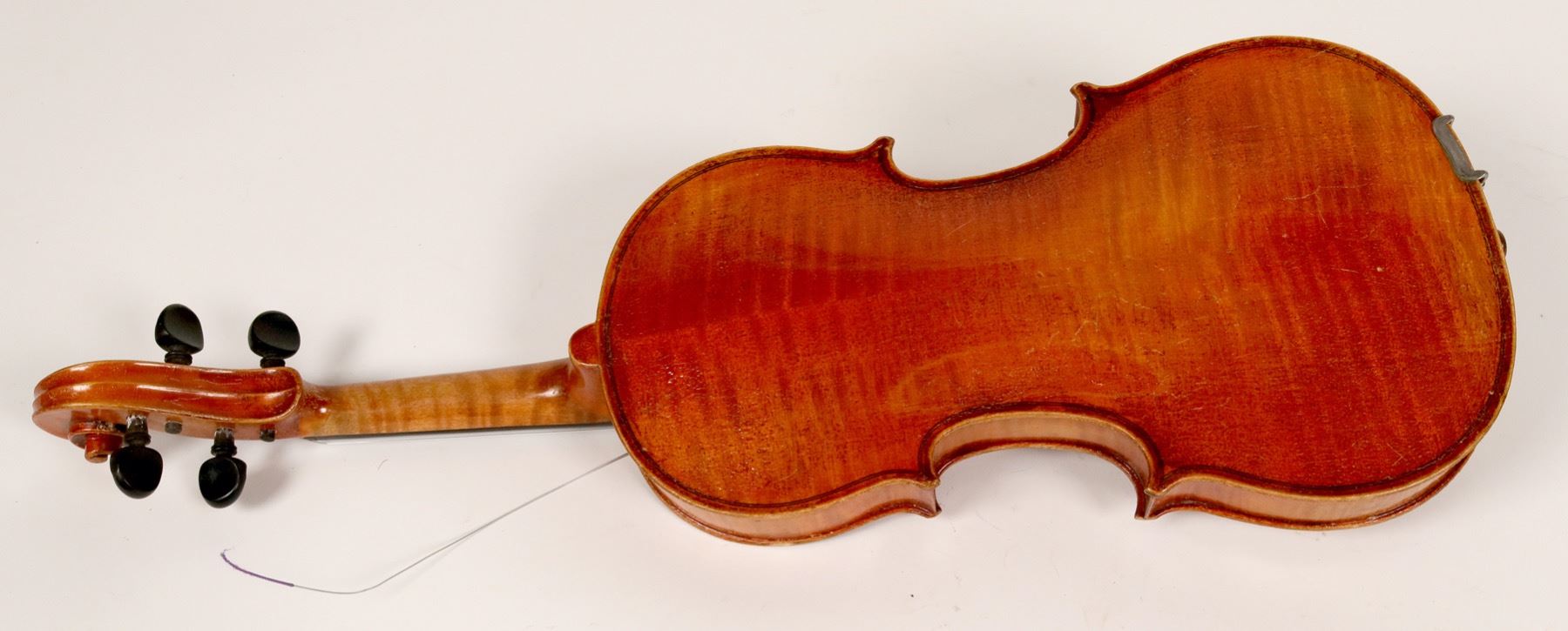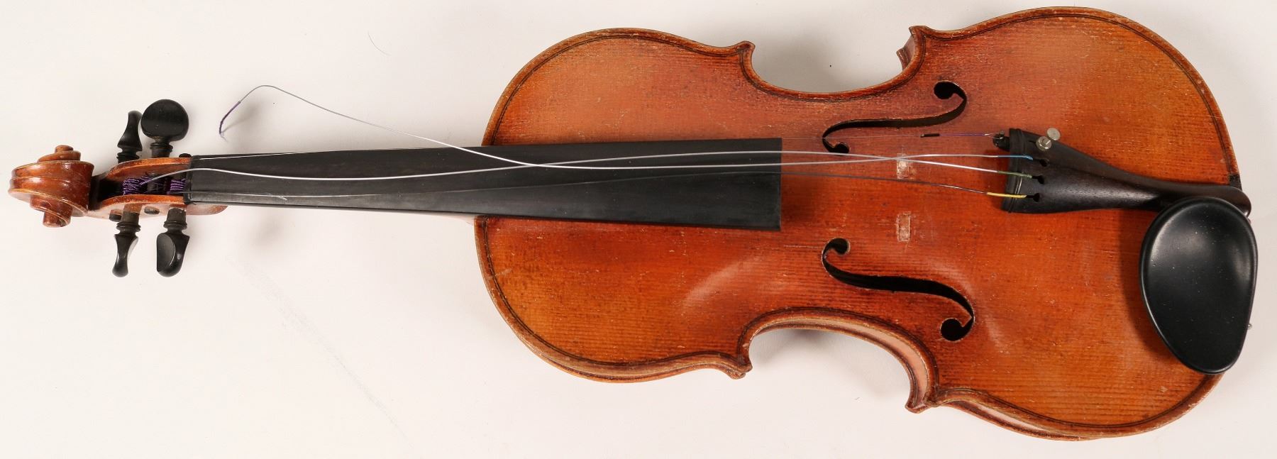 Lot of 1. Factor built (commercially built) German violin was made in the 1930's. The violin has good sound on the three treble strings but tends to go dead on the bottom string. The bow is a beginner's bow.