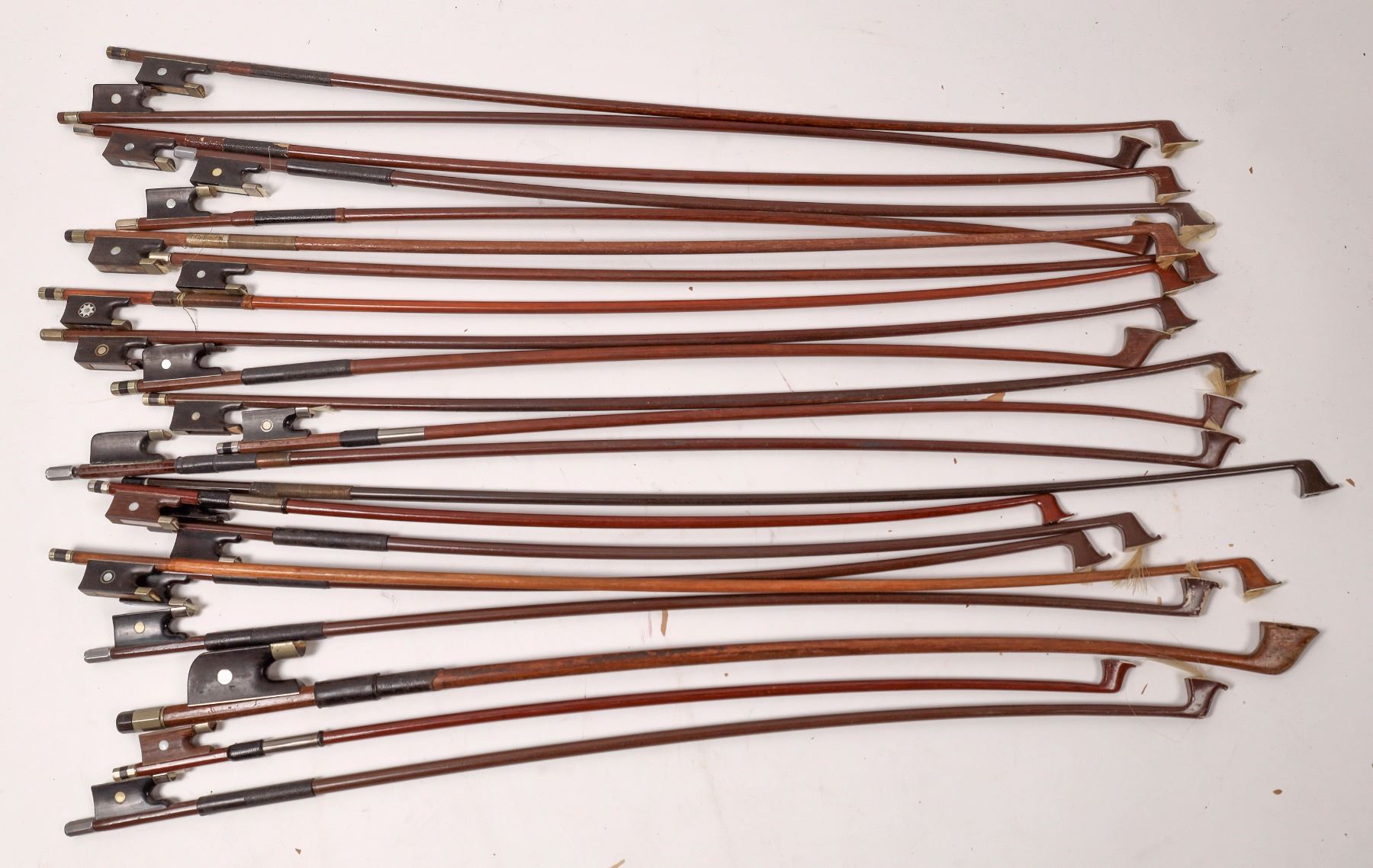 14): Violin bow made by unknown company. Mother of pearl and pearl eye used at the frog. No bow hair, metal winding, or faux leather grip present. Stick is warped slightly to the right. 28 inches.