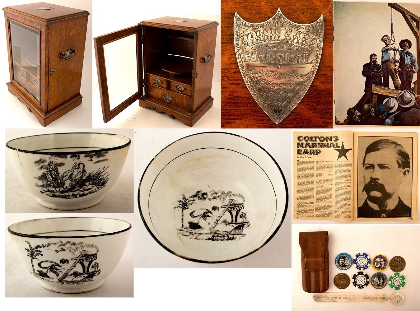Wooden cabinet measures 15" x 11.25" x 8 inches. Key and working lock. Rear panel appears to be cracked. Silver plaque on top of cabinet states "To Virgil Earp City Marshall" From The Good Citizens of Colton Calif". Includes a 5" round bowl with a woman, cross and faith on inside and outside, also outside is hope with woman, anchor and sailing ship. Bowl appears to be old and has been repaired. 5.5" leather cigar case with broken strap. 1.75" silver napkin ring inscribed Virgie. Non period shaving brush. Small brass cigar cutter. 9.5" Emde Bros. Germany folding razor. Chochise Saloon 1878 Tombstone I. T. white shaving implement with modern lettering. 8 modern casino tokens. 1 mother of pearl 5c casino chip marked CP?