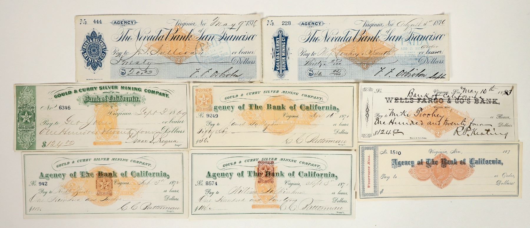 Lot of 8 different. Great RN group! Includes: Gould & Curry Mine 1869, RN-B plus printed green NV stamp, signed by Requa; 1870 Gould & Curry with RN-C plus NV adhesive revenue stamp, signed by CC Batterman; 1870 Gould & Curry with rare RN-B17b, signed by Batterman; 1872 G&C with rare RN-C21b, signed by Batterman; G&C 1876 with RN-G signed by FF Osbiston, rare variety; Best & Belcher 1878 with RN-G, signed by Osbiston; 1883 Wells Fargo/Bank of Cal. with RN-G, signed by RP Keating; and Woodworth Mill, 1870s, unissued, RN-D.