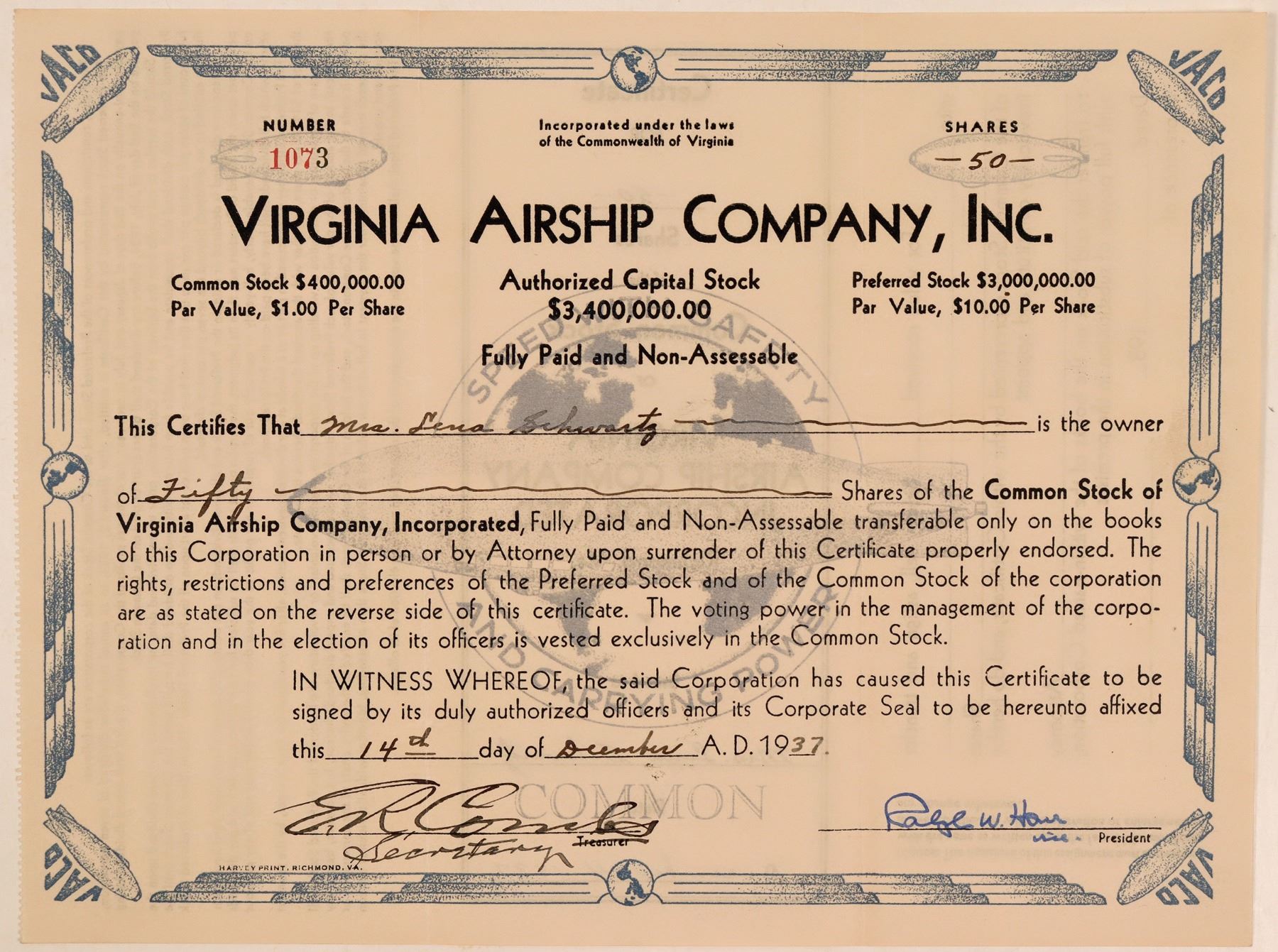 Dated 1937 (the year of the Hindenburg disaster. Incorporated in VA. Huge