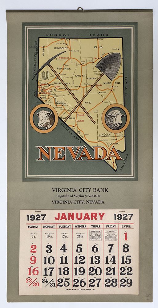 Large (23" x 12") calendar (green with black text) featuring an illustrated yellow map of Nevada (12.5" x 9.5") featuring vignettes of livestock and mining tools. Calendar pad (6.75" x 10") attached at bottom. "Virginia City Bank/ Capital and Surplus $35,000.00/ Virginia City, Nevada." Condition: horizontal creases (1/3 and 2/3 of the way down), and smaller creases/nicks along the edges. Overall good condition.