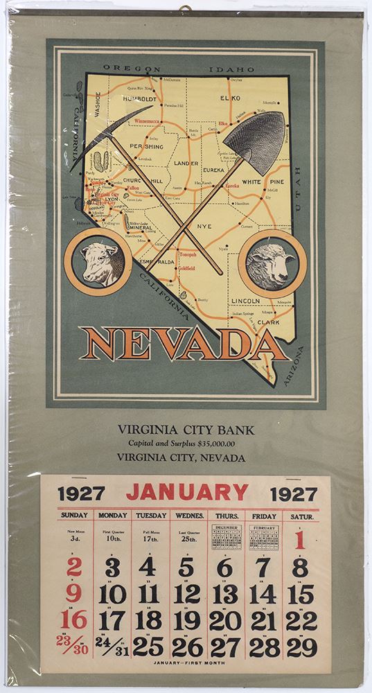 Large (23" x 12") calendar (green with black text) featuring an illustrated yellow map of Nevada (12.5" x 9.5") featuring vignettes of livestock and mining tools. Calendar pad (6.75" x 10") attached at bottom. "Virginia City Bank/ Capital and Surplus $35,000.00/ Virginia City, Nevada." Condition: tear in map (near sheep vignette) and on both sides of the calendar pad. Rough edge upper left.