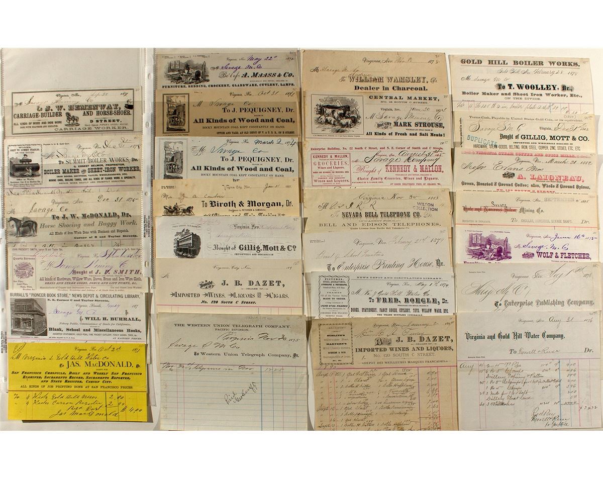 Lot of 27 with a few duplicates. Nice variety! Many pictorial. No territorial. Includes: J.B Dazet (unused and one used, 1897), Mark Strouse (pictorial, 1874), Will H. Burrall (pictorial, 1870s), J.W. Hemenway (pictorial, 1871), Summit Boiler Works (pictorial, 1878), J.W. McDonald (pictorial, 1875), J.P. Smith (pictorial, 1870), A. Maass & Co. (pictorial, 1872), J. Pequigney (pictorial, two from 1874), Gillig. Mott & Co. (pictorial and non-pictorial, 1864 & 1869), Biroth & Morgan (pictorial, 1897), Wolf & Flectcher (pictorial, 1875), T. Woolley (Gold Hill, 1878), Savage Mining Co. (1885), Fred Boegle (1874), Enterprise Printing House (1876 & 1879), Nevada Bell Telephone Co. (1889), Kennedy & Mallon (1865), Andrew Wamsley (1878), A. Laigneau (1889), Virginia & Gold Hill Water Co. (1876), Jas. MacDonald (1871), and Western Union Telegraph Co. (1875). Overall condition of group is very good. (Prag Collection)