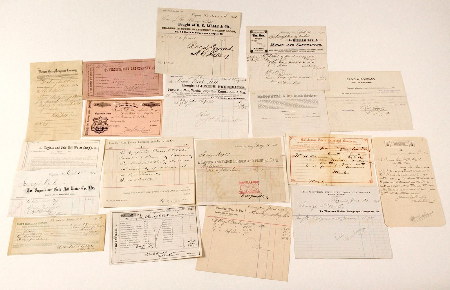 Lot of 18. This is a nice group worthy of inspection. 1) Twelve billheads: H.C. Lillie & Co. Books & Stationery (1868); William Box, Mason & Contractor (1875); two different Virginia City Gas Co. (1889 & 1892); Joseph Fredericks (1873); two different Carson & Tahoe Lumber & Fluming Co. (1880s and 1895); Virginia & Gold Hill Water Co. (1875); Wheeler, Hall & Co. (1887); Wm. Sutherland Printer (1902); Zadig & Company Stock Brokers (1911); and Western Union Telegraph Co. (1875). 2) Territorial California State Telegraph Co. receipt for message received at Austin, NV, Jan. 4, 1864 from San Francisco to Wm. H. Duncan. 3) McConnell & Co. unused stock brokers receipt, Carson City, 1870s. 4) 1875 receipt for Hall's Safe & Lock Company for a $2,000 safe to be delivered at the Carson City Savings Bank! 5) 1888 County Clerk receipt, Virginia City. 6) 1875 Western Union Telegraph to M.N. Stone in Virginia City from Jeffries in Washington DC. To Give 30 Days Notice to opposite attorneys of motion to dismiss. Stone was the lawyer for the Sutro Tunnel. 7) IOOF 1906 pink receipt, Virginia City. Date: 1864-1911 Location: Virginia City, Nevada HWAC# 572021
