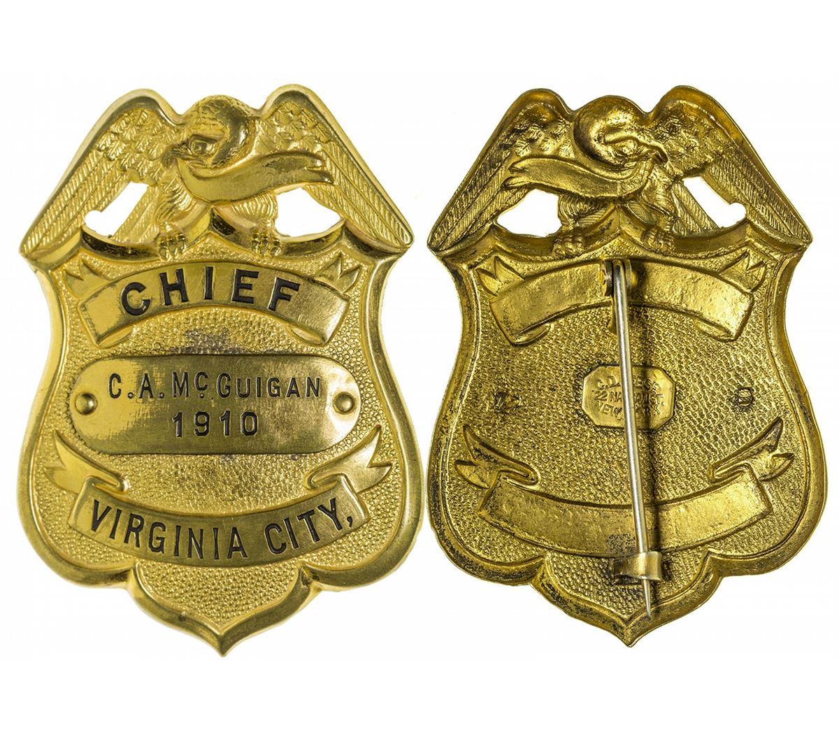 Front of badge reads: CHIEF/ C.A. McGUIGAN/ 1910/ VIRGINIA CITY, Reverse has maker's mark: C.D. REESE/ 122 NASSAU ST./ NEW YORK. Reese is a well-known maker of badges from this period.