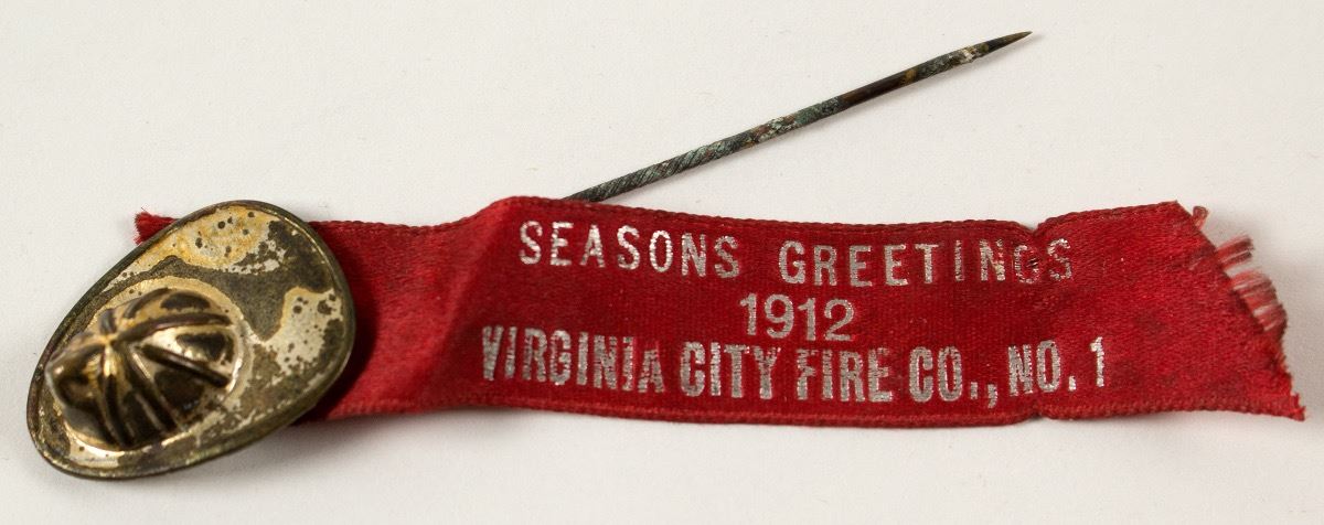 Fireman's ribbon from Virginia City Montana that has a brass pin with the shape of a fire fighter helmet at the top and a red ribbon with silver lettering that says, "Seasons Greetings 1912 Virginia City Fire Co., No. 1". 4" Long. City: Virginia City State: Montana, Date: 1912 Inventory# 40471