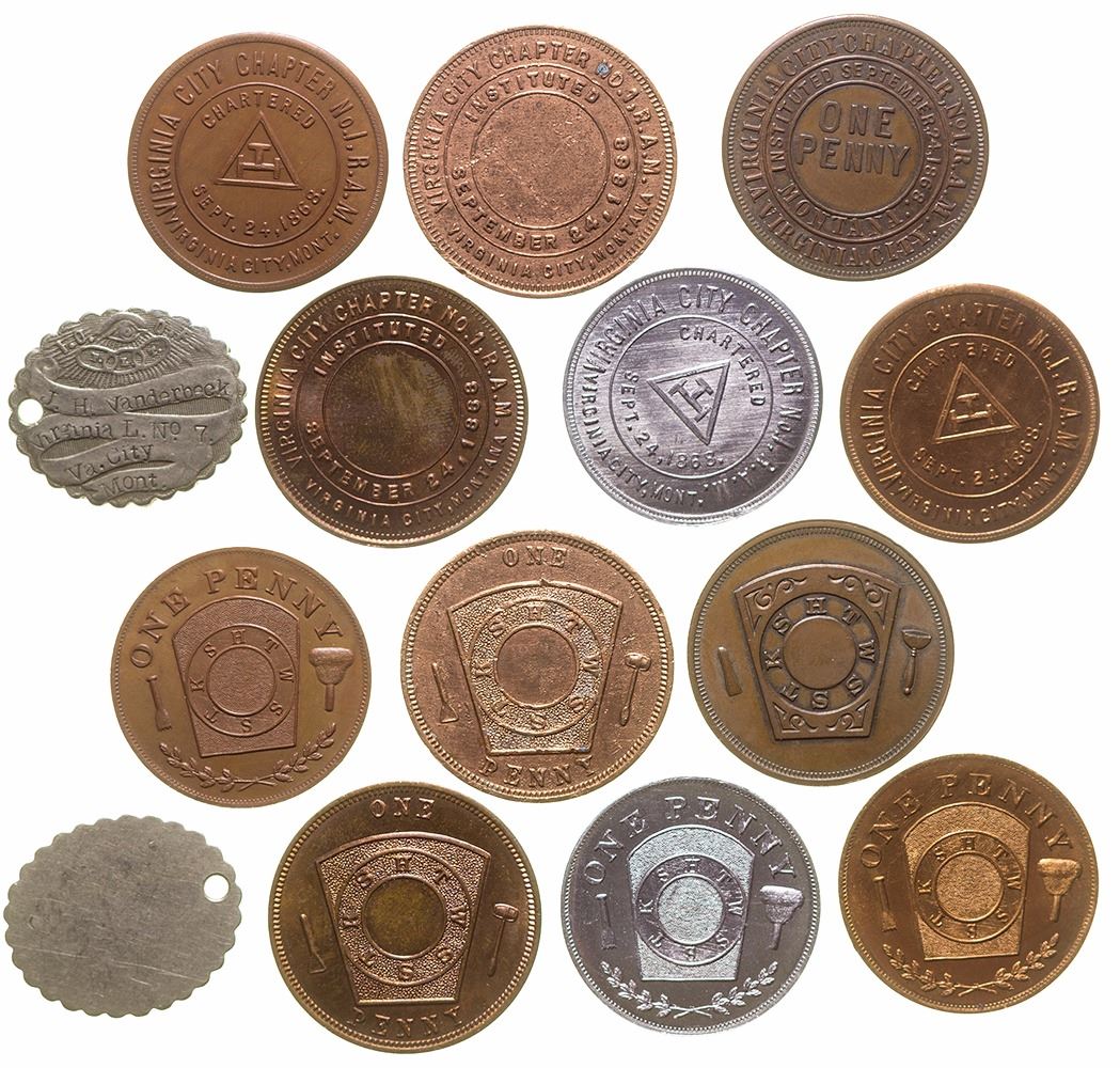 Eight Fraternal tokens: R. A. M. copper, aluminum, brass. 1868 chapter no. 1. Also, Virginia Lodge no. 7, I.O.O.F. State: Montana City: Virginia City Date: FHWAC#: 41625