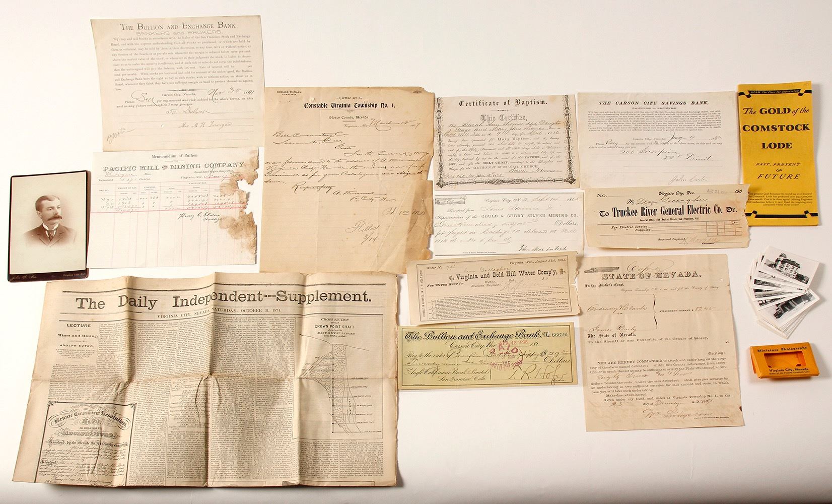 Lot of 15. Includes: 1) John S. Noël cabinet card (identified on reverse as William Henry Harris of Silver City), c.1880s. 2) Depression-era (1932) brochure advertising the mining history and possibilities of the Comstock Lode. "Gold, The Cure for the Depression." Published by Hewitt & Co., San Francisco. 20 pages. 8.5" x 3.75" Some pencil notations on the inside. Rare period for the Comstock and the emphasis on gold, not silver. 3) Carson City Savings Bank voucher for sale of Scorpion stock, 1883, and Bullion & Exchange voucher for Bulwer stock sale, 1891. 4) 1874 Daily Independent Sutro supplement full of mining illustrations. 5) 16 miniature black-and-white photos. 6) Two-page magazine article about Sutro by Edward Schuman. 7) 1865 Gould & Curry Silver Mining Co. draft (with NT dateline) for the delivery of castings to the mill. 8) 1879 Methodist Episcopal Church, Gold Hill, Nevada Certificate of Baptism for Sarah Ann Thomas. 9) Rare but damaged Pacific Mill & Mining Co. assay sheet for ore deposited by the Morgan Mill, 1878. 10) 1907 letter from Virginia City constable Richard Thomas (heavy damage on right side). 11) Truckee River General Electric Co. receipt, 1904. 12) Virginia & Gold Hill Water Co. receipt, 1904. 13) 1869 court document. 14) Bullion & Exchange Bank check, 1896 signed by T.R. Hofer, who was once supt. of the Carson City Mint. Interesting group. Please inspect! Date: Location: Virginia City, Nevada HWAC# 572025