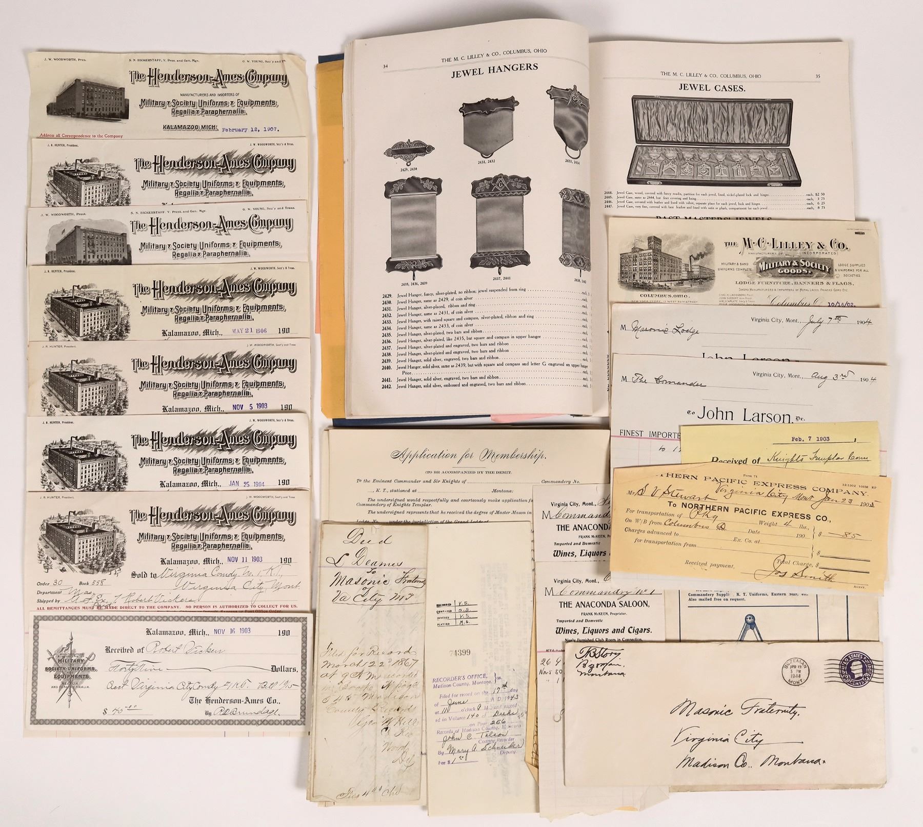 Treasure trove of paperwork pertaining the Masonic Knights Templar Association of Virginia City Montana. Deed dated March 22, 1867 Montana Territory, concerning the Knights Templar; two Masonic Supply and uniform catalogs and billing receipts for orders. Receipts from the Anaconda Saloon and John Larson for alcohol.