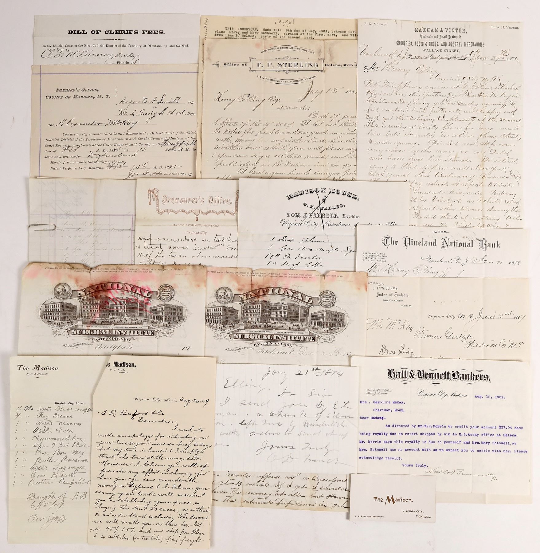 17 pieces of Virginia City, MT correspondence. 1901 mining indenture. Madison County 1895 witness order. Bill of clerks fees 1874. Letterheads and billheads, National Surgical Institute letterhead 1879 with stains and tears. Vineland(NJ) National bank 1878 letter to Henry Elling. Judge Williams 1887 probate letter and more.