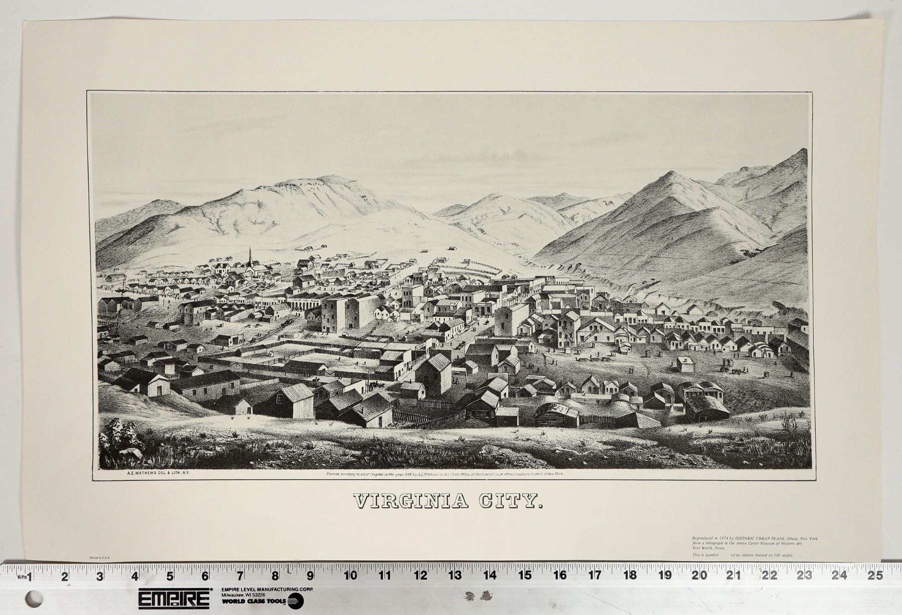 Rare 1974 reprint of 1868 Virginia City, MT by Matthews. Limited edition of 500, unnumbered. 15.5x24.5".