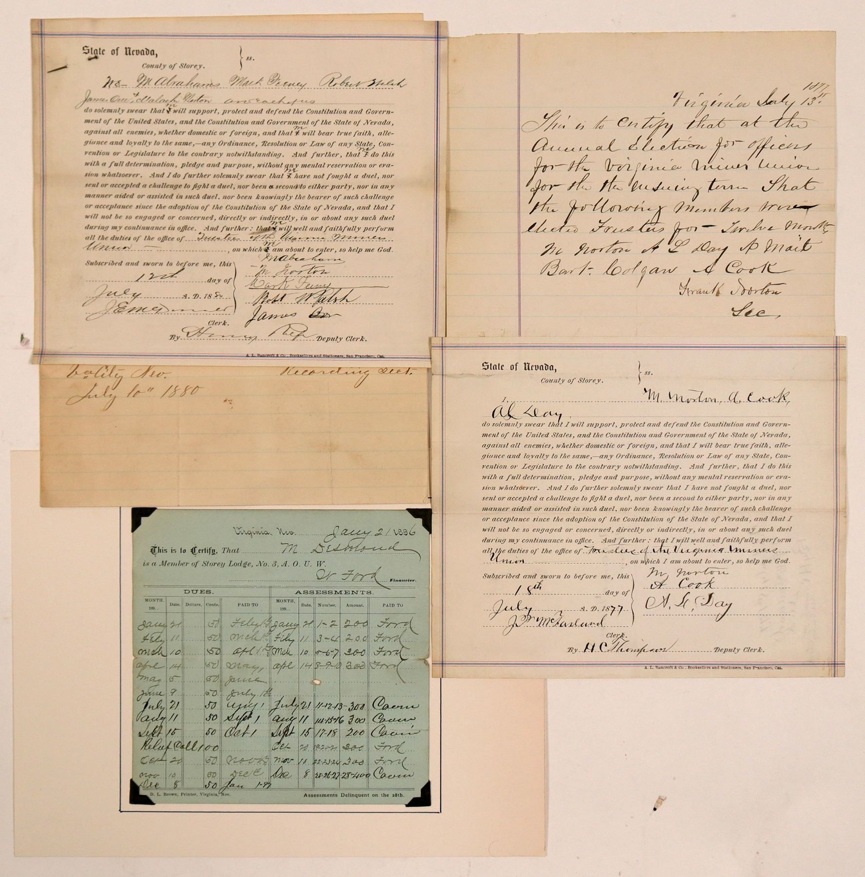 Lot of 3. Rare to find material from the Virginia City Miner's Union. 1) 1877 handwritten document announcing trustees elected at the annual meeting: A. Cook, AL Day, and M Norton. Signed by secretary Frank Norton. Attached to Storey County form. 2) Similar item, but this time from 1880. M. Abrahams, Mark Feeney, Robert Welsh, M Norton, and James Orre are elected trustees. Also attached to Storey County form. 3) 1896 lists of dues for M. Desmond for the AOUW, Storey Lodge, No. 3. (Sutro-Comstock Collection)
