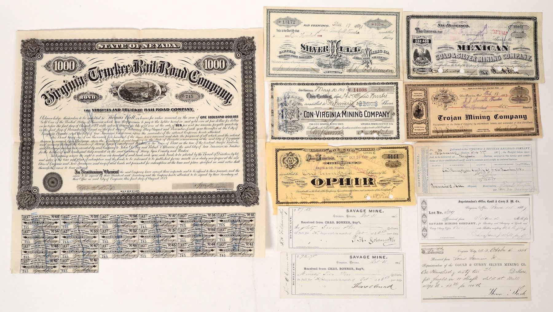 Virginia City Nevada mining stock certificates for the Con-Virginia Mining Company, The Ophir, The Silver Hill Ming Company, The Virginia & Truckee and more. Great stuff. Please see photos for more detail Virginia City Nevada