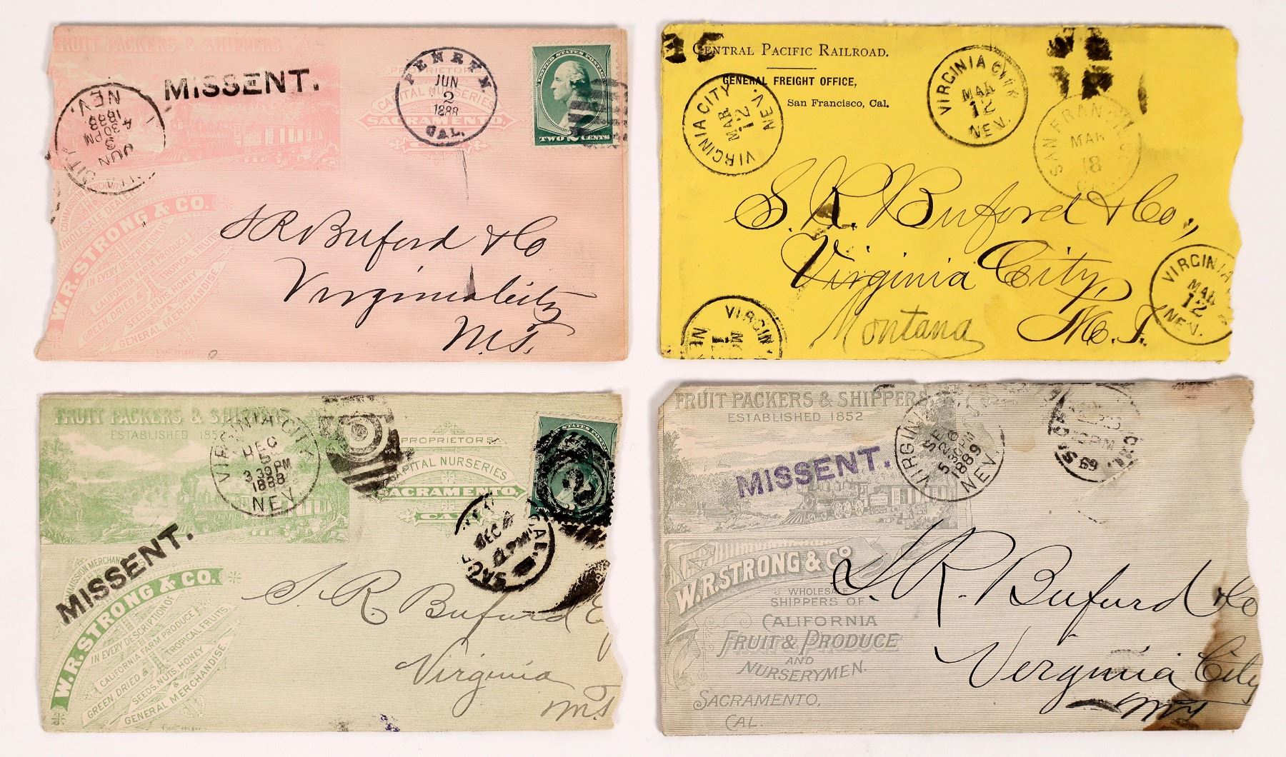 4 missent covers, 3 with front advertising. All addressed to S R Buford, Virginia City, MT, however they were all delivered to Virginia City, NV. Covers are stamped missent and forwarded to Virginia City, MT. Two of four have stamps.