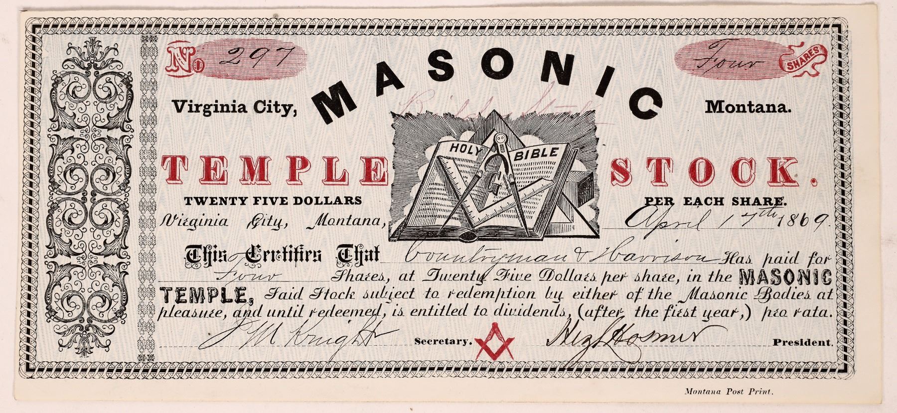 We have never seen this Masonic Temple stock before. It appears to be real and have never seen a reproduction. Issued 1869 with red highlights and Mason logo in center. Fine condition. Please inspect.